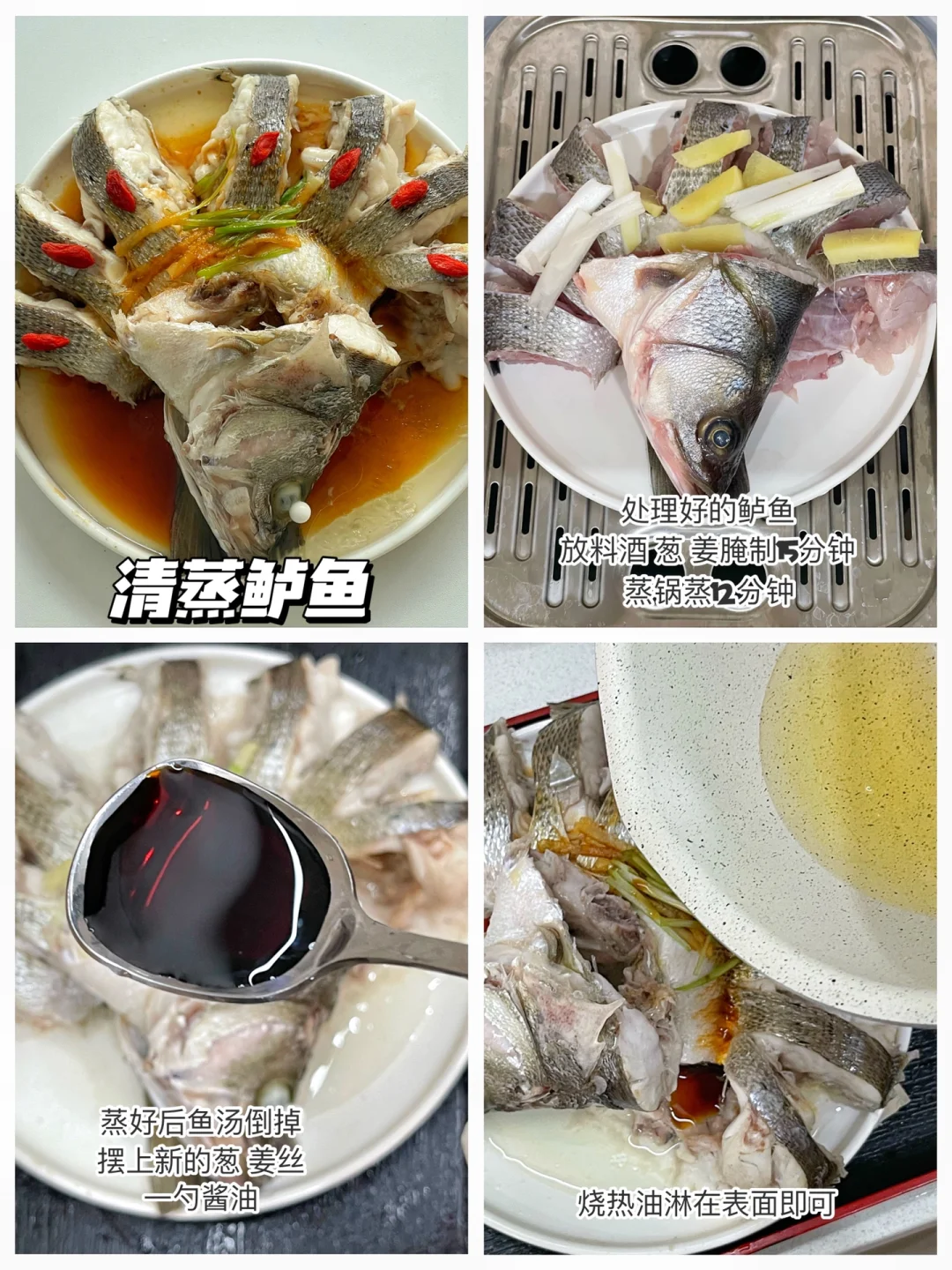 🔹做法:处理好的鲈鱼放料酒、葱丝姜丝腌制15分钟。上锅蒸12分钟。蒸好后的鱼汤倒掉,放上新的葱丝、姜丝,表面淋上生抽,烧热油淋在表面即可