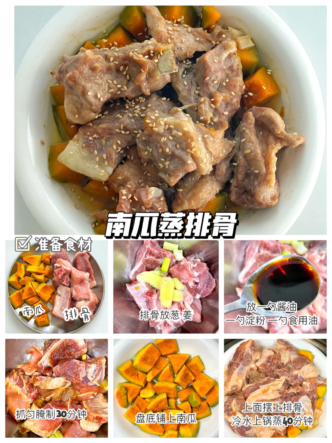 🔹做法:排骨放葱、姜、一勺酱油+一勺食用油+一勺淀粉抓匀腌制30分钟。盘上底部铺上南瓜片,上面放上排骨,冷水上锅蒸40分钟