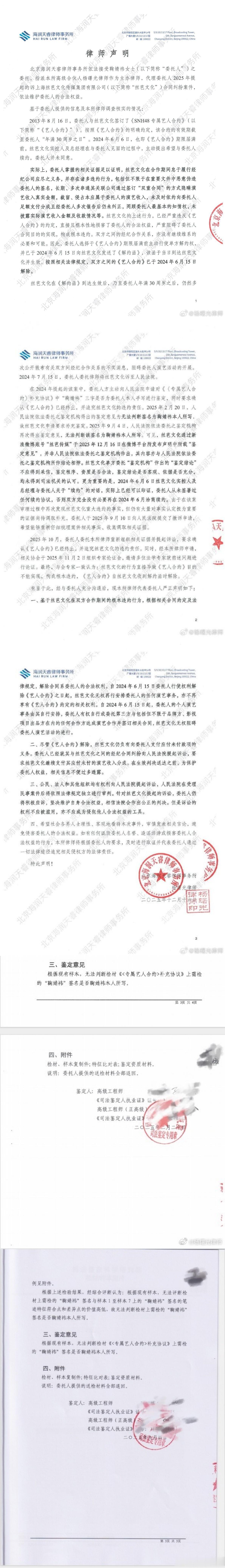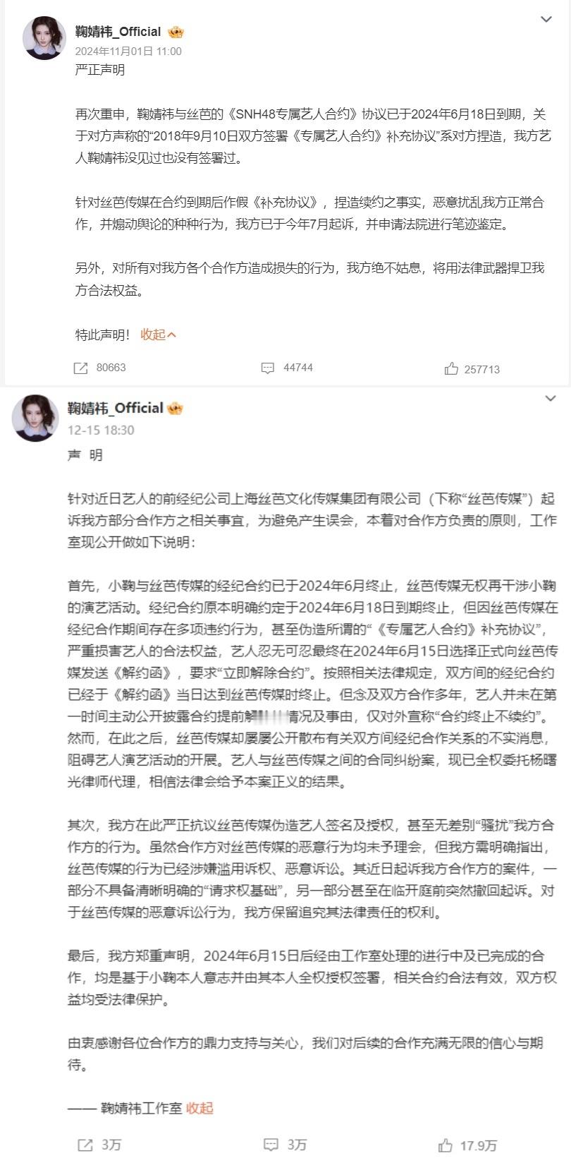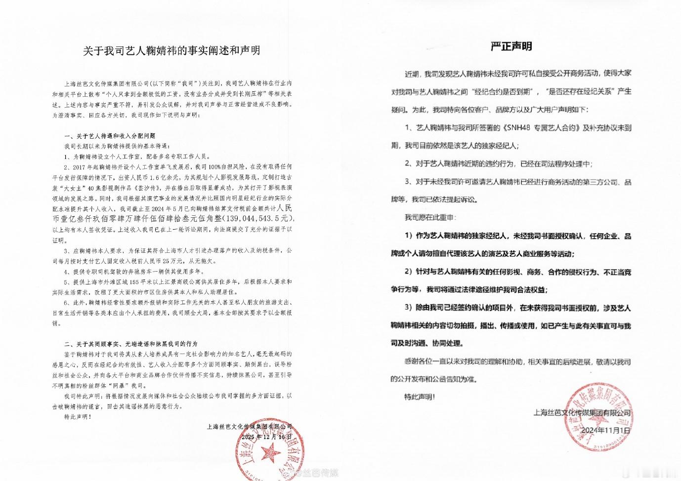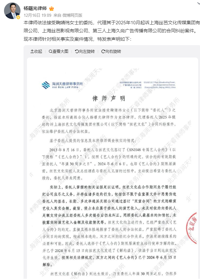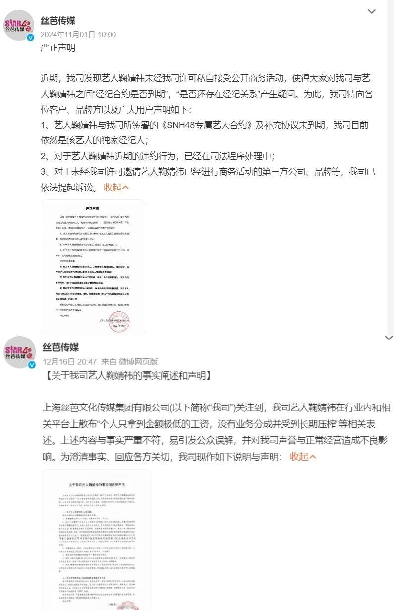鞠婧祎每月25万元固定工资近日,艺人鞠婧祎与其经纪公司丝芭传媒的合约纠纷引发热议。12月16日,丝芭传媒发布声明称,2017年起每月支付鞠婧祎税前25万元固定工资,核心目的是满足上海人才落户的纳税条件。此外,公司提供外滩155㎡江景公寓(后升级更大住房)、奔驰房车配专职司机,并全额报销其私人旅游、朋友日常开销等非工作支出。截至2024年5月,公司累计向鞠婧祎支付税前1.39亿元(含工资、分成及福利),并出示本人签收凭证,强调包含《芸汐传》1.6亿制作成本等投入。与此同时,鞠婧祎工作室联合律师连续发布声明,明确指控前经纪公司丝芭传媒伪造合约、恶意诉讼,并强调双方经纪合约已于2024年6月15日依法解除。称法院认可的笔迹鉴定无法鉴定是鞠婧祎本人所签,鞠婧祎是独立艺人。鞠婧祎宣布已是独立艺人 此外,前队友徐言雨昨夜也发文公开控诉丝芭传媒漠视艺人健康保障,揭露2022年底鞠婧祎感染新冠时缺药少水、助理失联的困境,直指公司对头部艺人的基础照料严重失职。鞠婧祎前队友徐言雨发声