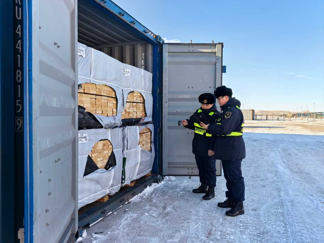满洲里车站海关关员在对中欧班列集装箱货物开展查验。通讯员陈柳摄