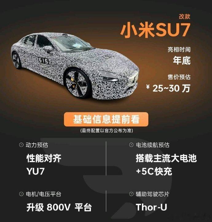 小米SU7换代或涨价2万元小米新一代SU7明年二季度上市 我觉得SU7最不可思议的是以已经发布1年9个月了,它居然还能保持如此之高月销量和热度,整个2025年SU7销量已经来到了24.7万,位列20万以上轿车市场第一,要知道很多竞品已经换了好几代了,可见一开始就把各方面做到位这个决定是非常正确的,这样做也能为消费者避免被疯狂背刺的痛苦。我个人估计,小米SU7改款应该还在定在明年3月发布,然后明年4月(即二季度)上市销售。从YU7标准版起步就是thor+激光雷达来看,小米SU7应该也是如此。对于SU7标准版来说,智驾硬件是从无到有,这个成本是无论如何也减不掉的,一套带智驾芯片的板子+一枚激光雷达再辅以各种雷达和传感器,大几千至1万的硬件成本是逃不掉的,剩下的就是诸如升级800v、升级内外饰、升级电机电控等等细节,这些怎么也得有个1万,因此从21.59涨价2万到23.59万是非常合理的,甚至我还觉得便宜了。当然,即便是放在2025年哪怕即将到来的2026年,小米SU7 MAX的三电、性能、操控、内外饰,乃至智驾算力冗余,它都是非常能打的,我依旧是非常推荐购买的,而且现在下定很快就能提车,还能享受最后的免购置税政策。如果你不嫌弃,也可以去看看准现车或者展车,还能在免购置税的基础上再便宜一大截,非常之香!小米两款车的销量都可以证明,小米已经取代特斯拉成为电车首选,买车就买销冠,要买就买最好的!