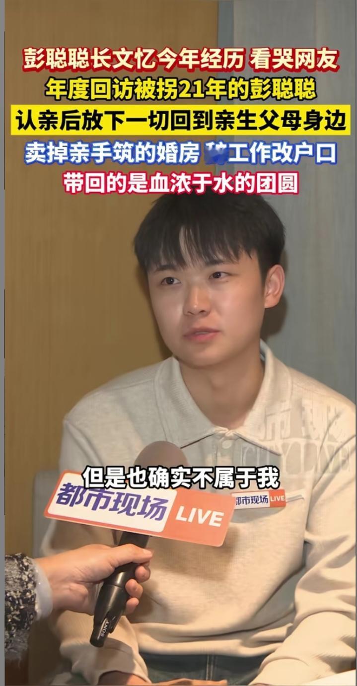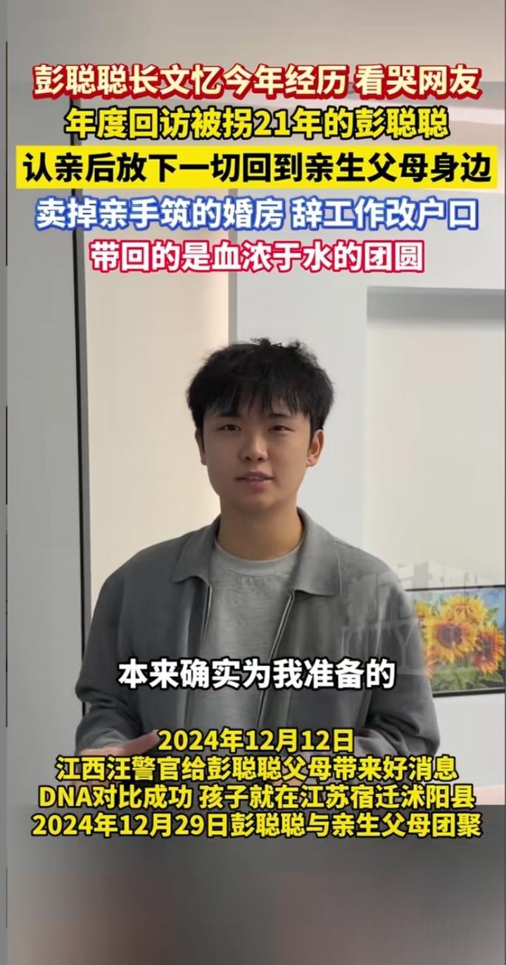 北京德胜门到江西红地毯:26岁彭聪聪用21年走完回家路 北京德胜门的老市场烟火依旧,谁还记得2003年11月那个被糖块诱走的4岁孩童?江西南昌的村头红毯绵延800米,21年后的团圆烟火,终于熨平了一个家庭的半生褶皱。 1999年出生的彭聪聪,1岁时随父母赴京谋生。2003年11月21日,母亲回家做饭的十几分钟里,在市场玩耍的他被人贩子抱走,从此“彭聪聪”这个名字,成了父母行囊里最沉重的牵挂。他们关停生意,寻人启事贴满北京街巷,堆起来比人还高;踏遍江苏、河南的寻亲现场,曾遭骗子勒索,却从未停下脚步。家里孩子的房间始终原样保留,玩具与衣物静静等候,这一等,便是21年,父母青丝熬成白发,母亲眼睛几近哭瞎。 2024年12月,DNA比对的电波划破时空,江西警方带来了“孩子找到了”的消息。母亲愣了十几分钟才敢相信,父亲则在认亲现场红着眼不敢拥抱。12月29日的北京,亲人围拢呼喊“聪聪”的瞬间,血脉里的羁绊冲破了岁月阻隔。送别时父母偷偷抹泪、暗拍身份证的不安,让彭聪聪下定决心:“要给他们一颗定心丸”。 十天内,他注销江苏宿迁的户籍,做回真正的彭聪聪;卖掉装修好的婚房与汽车,将款项归还;辞去上海的稳定工作,毅然奔赴江西。南昌老家的团圆饭上,21个生日蛋糕叠起,姐姐们轻声说:“以后每年都不缺席”。正如他在长文中所写:“2025年是被爱与团圆填满的重生之年”。 “所谓父女母子一场,不过是相互牵挂的漫长修行”,彭聪聪的决绝,是对21年错位时光的救赎。有人赞他清醒,有人议他“绝情”,你如何看待这份跨越半生的奔赴?彭聪聪