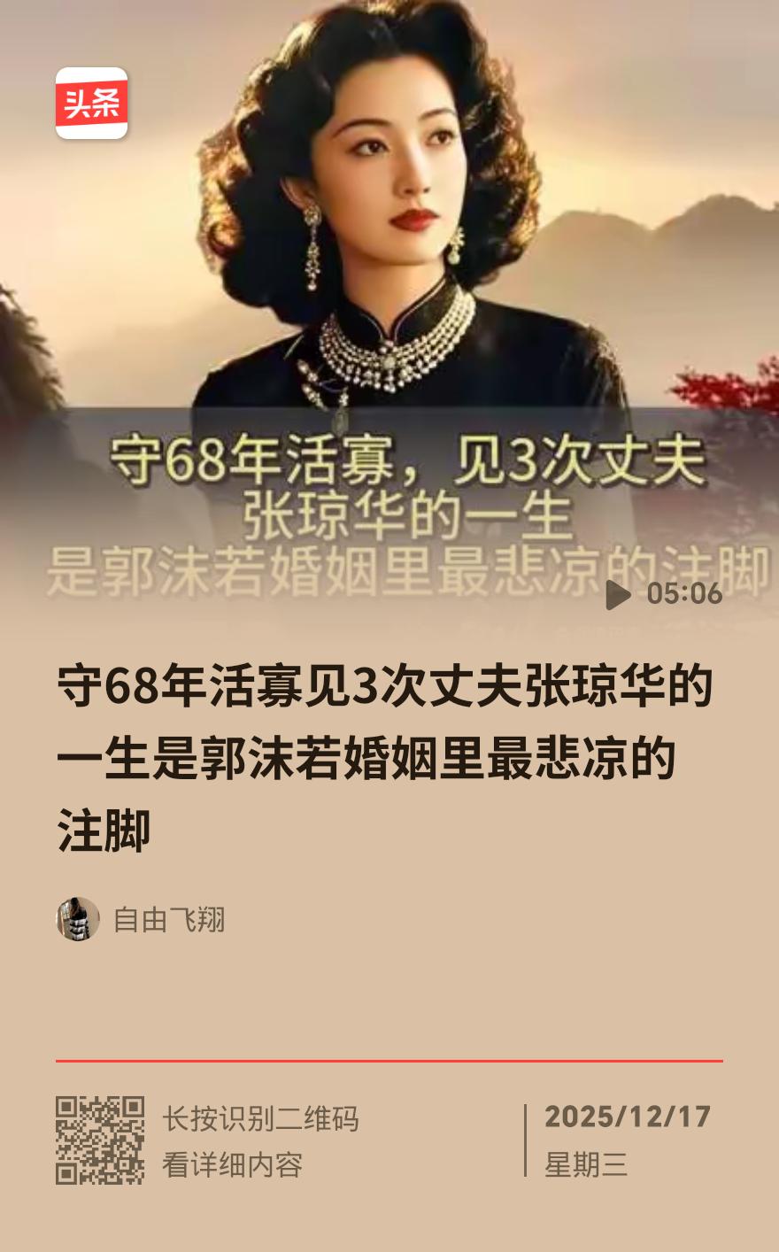 洞房夜遭拒,守寡68年!郭沫若发妻张琼华的一生,满是悲凉 1912年,一封“母病危”的家书,把在成都求学的郭沫若骗回乐山老家。推开家门,没有病床,只有张灯结彩的喜堂,一场父母包办的婚姻正等着他。 新娘张琼华是个懂礼数、会针线的大家闺秀,可裹着的小脚、普通的容貌,和郭沫若追求的自由恋爱格格不入。洞房之夜,他嫌弃地要去书房睡,张琼华拉着他苦苦哀求,只求能留个孩子,却还是被冷漠拒绝。 婚后第五天,郭沫若便远赴日本学医,还在异国与佐藤富子同居生子,彻底抛下了这个发妻。他在给弟弟的信里直言,这桩婚事和自己毫无关系。 留在郭家老宅的张琼华,默默扛起了所有。她伺候瘫痪的公公,端屎端尿毫无怨言。婆婆心疼她,劝她寄张照片给郭沫若。她翻出大红嫁衣,细细缝补好磨破的袖口,才拍下照片寄出去,可这份卑微的讨好,只换来郭沫若的随手搁置。 1939年,已是文坛巨匠的郭沫若带着第三任妻子衣锦还乡。张琼华因自卑躲进柴房,被老爷子拽出来后,只换来丈夫愧疚的一躬。当晚,她把婚床让给丈夫和新妻,自己抱着旧棉絮睡在冰凉条凳上。 郭沫若留下“书付琼华”的条幅,成了她后半生的精神支柱。新中国成立后,她靠糊火柴盒度日,听着喇叭里郭沫若的文章打发时光。1980年,张琼华在孤寂中离世,一生都没等来丈夫的回头。 这段被时代和个人选择裹挟的婚姻,道尽了旧时代女性的无奈与悲凉。
