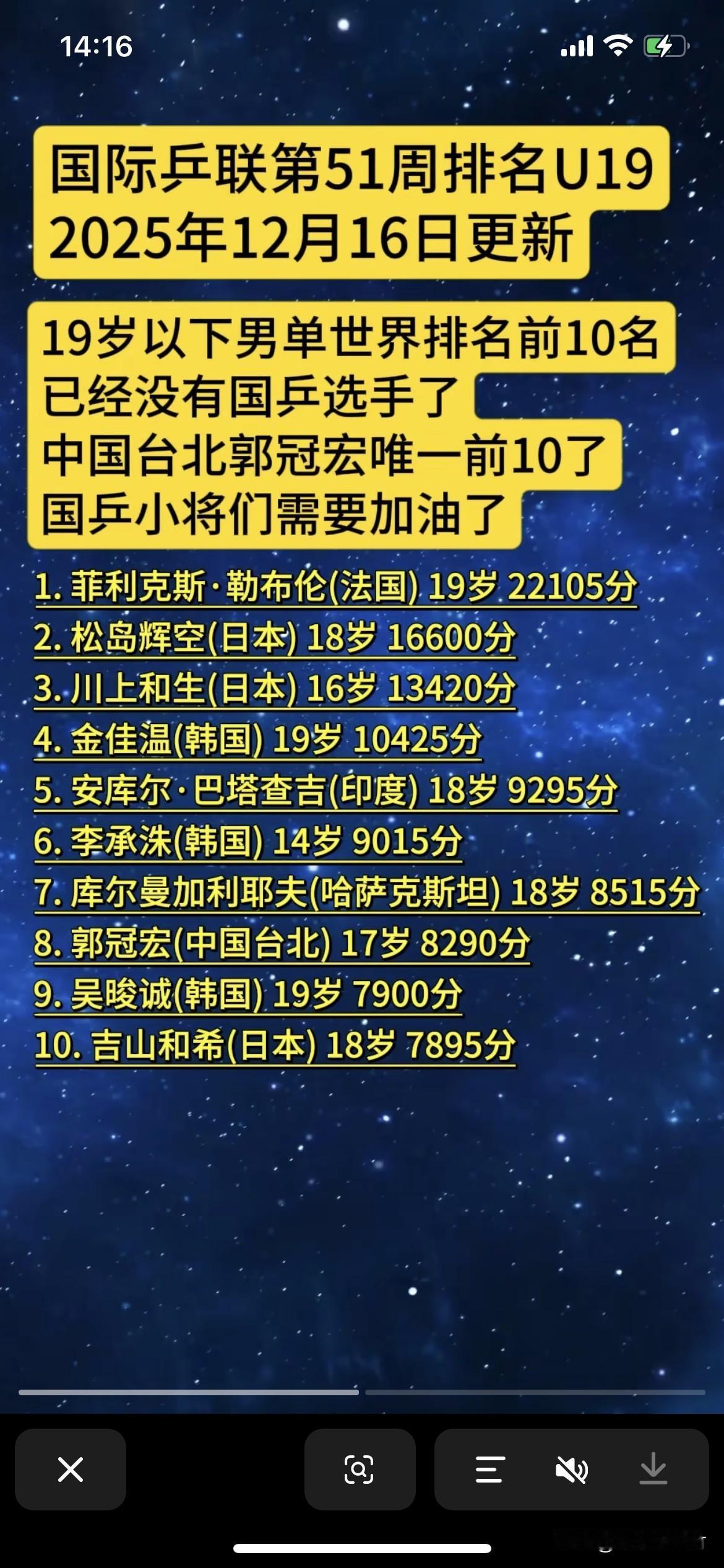 19岁以下男单世界排名前十没有中国选手[流泪] 中国台北郭冠宏第八 19岁以下女队世界排名前十有两位中国选手 覃予萱第四。 纵歌曼第六。 国乒小将们加油吧! 好好培养年轻队员。发掘优秀人才。 让我们的乒乓球后继有人。尤其国乒男队。加油加油吧!