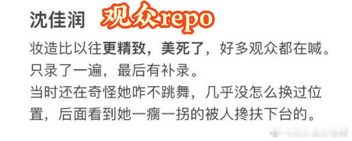 沈佳润带伤录跨晚 沈佳润也太拼了!带伤完成跨晚舞台录制,repo 反馈妆造精致、