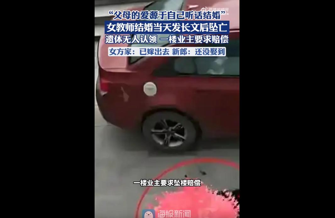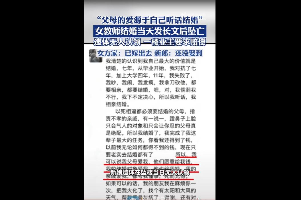 河南 28 岁女教师新婚当天坠亡,留遗言称 “以死相逼难改变”,遗体遭双方家属推诿,一楼业主还索要赔偿。 她曾笔试第一上岸,生前委托朋友扬骨灰,事件暴露催婚下的人性冷漠。 笔试第一的优秀教师,竟被 “结婚” 逼到跳楼,这哪是 “为你好”? 分明是把女儿当 “完成任务” 的工具! 父母催婚时喊着 “爱你”,女儿死后却把遗体当烫手山芋,推给新郎家 —— 亲情在 “嫁出去的女儿” 标签前,凉得像冰! 新郎家也没好到哪去,拿 “没完成仪式” 当借口,连逝者最后一点尊严都不肯给。 更讽刺的是,一楼业主不想着惋惜生命,先惦记着索赔,满脑子只有利益,人性的冷漠被展现得淋漓尽致! 她穿着新中式讲课的样子多亮眼,可在某些人眼里,再优秀的成绩、再美的风采,都不如披上嫁衣 “圆满”。 这场悲剧戳破了多少 “催婚即关爱” 的谎言? 女孩们的人生不是 “必答题”,别让 “结婚” 成为逼死她们的刑场! 法律或许管不了催婚,但人心该有底线 —— 别让 “为你好” 变成杀人不见血的刀!