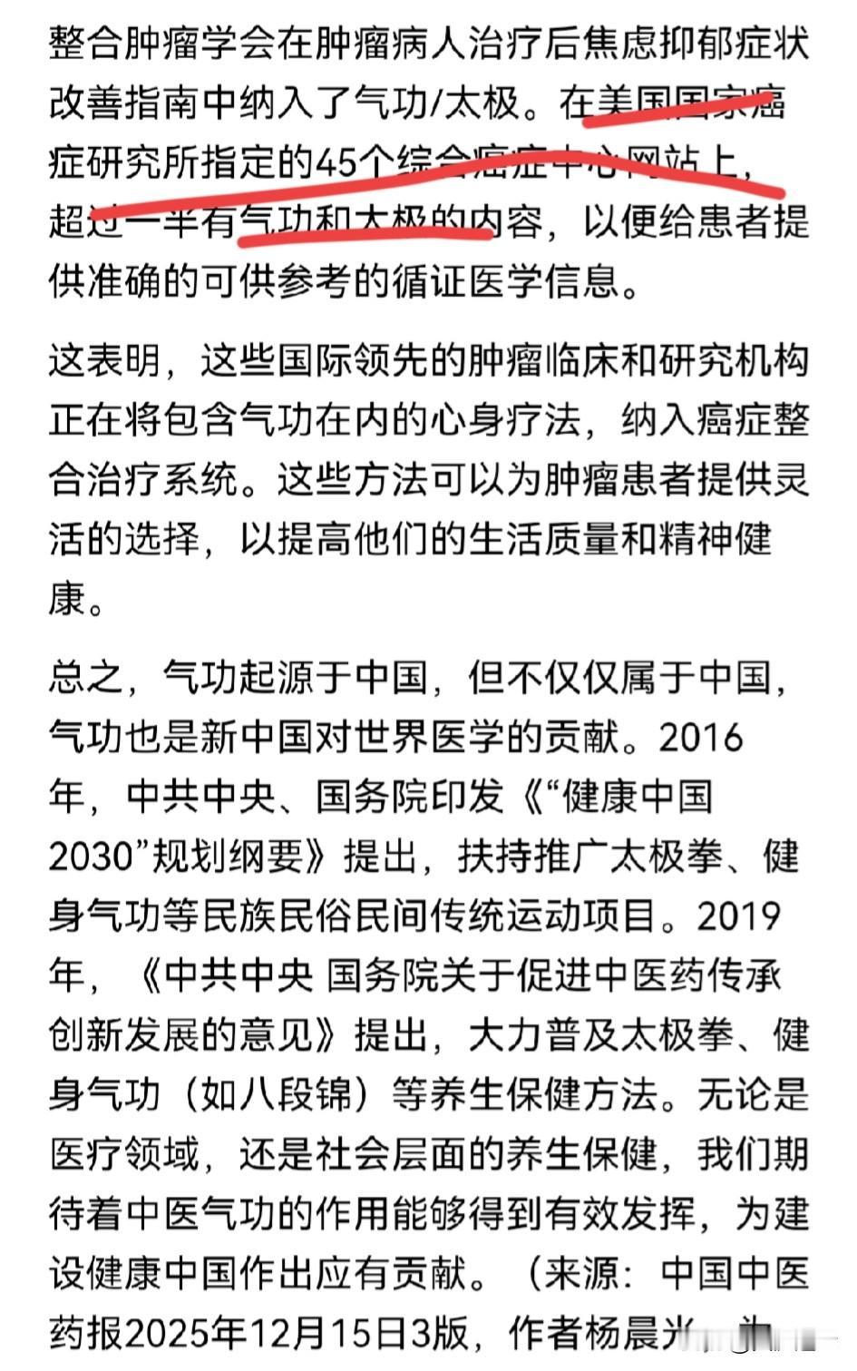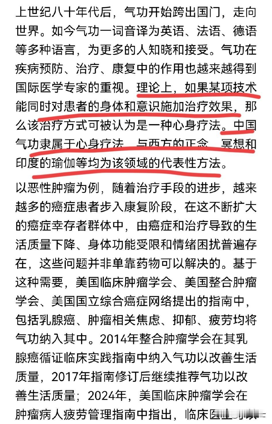 《中国中医药报》:气功是新中国对世界医学的贡献。 文章说中医气功是调身、调息、调心三调合一的一种心身锻炼技能。这是一种心身疗法,能同时对患者的身体和意识施加治疗效果,与西方的冥想、瑜伽、正念等都是心身疗法的代表。文章还说气功在疾病的预防、治疗以及康复中越来越得到国际医学界的重视,特别是在肿瘤和癌症方面,气功能给癌症患者提供灵活的选择,提高他们的生活质量和精神健康。 但这里的气功是八段锦等导引功法,并非大家喜闻乐见的隔空发功和点穴等,跟太极拳类似,是一种强身健体和提高心魄的气功。要知道上世纪末已经打假了那么多“气功大师”,我想应该不会走回头路的。