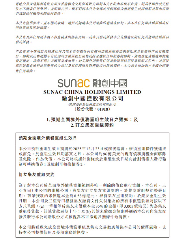 12月17日,融创中国(01918.HK)在港交所公告,公司预计重组生效日期将于2025年12月23日或前后落实,惟须重组条件获达成或豁免。于重组生效日期落实之日,公司约96亿美元的现有债务将获全面解除及免除,作为代价,公司将根据计划条款于重组生效日期向计划债权人发行强制可转换债券1及强制可转换债券2。