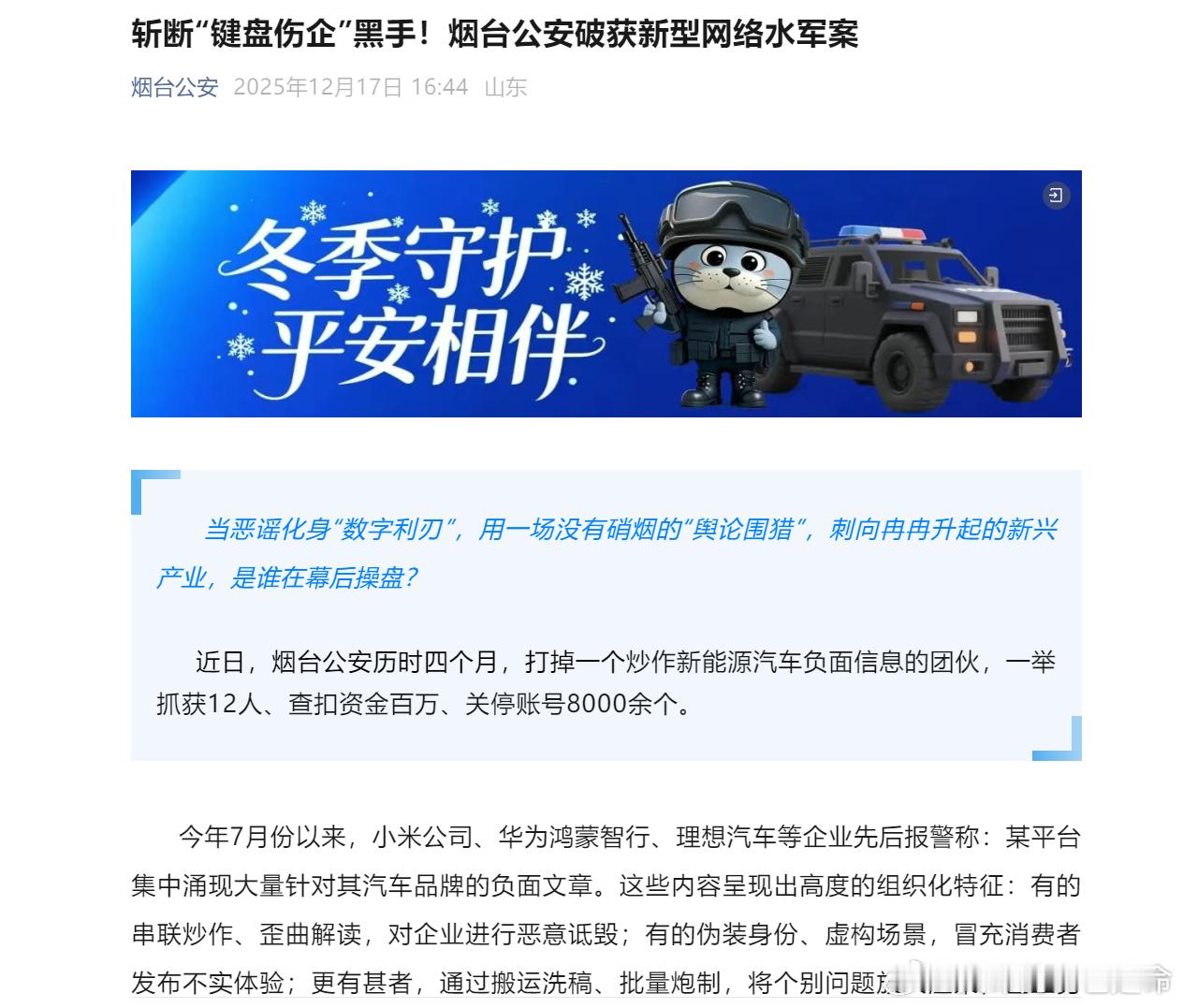 烟台打击黑公关这个事,要和另一个事连起来看:12月1日-12月14日,全国乘用车市场零售76.4万辆,同比去年12月同期下降24%已知1.年末临近,车市是传统旺季,但现实是车市销量大幅下降,这样的下降幅度,疫情之后还是头一遭2.推广新能源乃是国策可得:还想发车企负面=做好炸号,甚至是喝茶准备黑产操纵8000余个账号抹黑小米华为理想