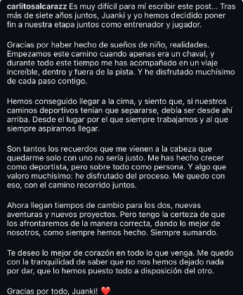 阿尔卡拉斯在社媒中写道:“写这篇文章对我来说非常艰难....在共同度过了七年多的时光后,胡安和我决定结束我们作教练和球员的合作关系。”