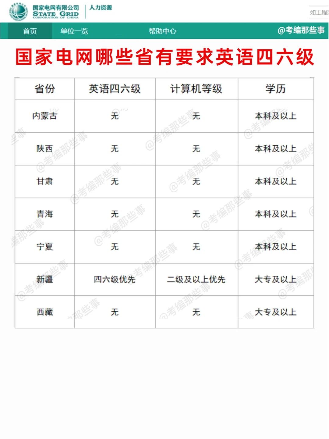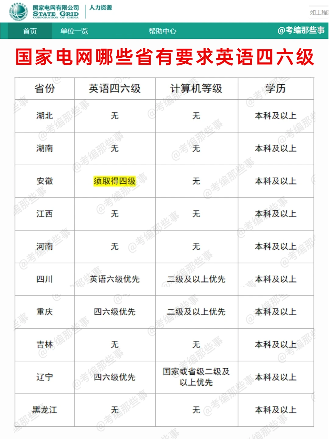 关于国家电网 英语四六级有严格要求的是山东、江苏、上海、安徽 计算机等级有严格要求的是山东、江苏 - 四六级和计算机有优势的省份: 天津、河北、冀北、山西、四川、重庆、辽宁、新疆 - “冀北”的地区是唐山、张家口、秦皇岛、承德和廊坊 - 学历一般是本科及以上,新疆和西藏只要大专及以上就行