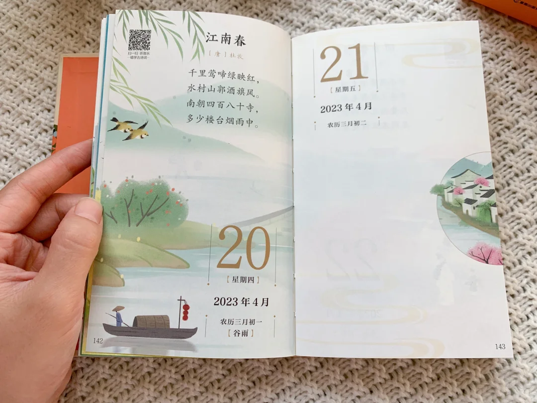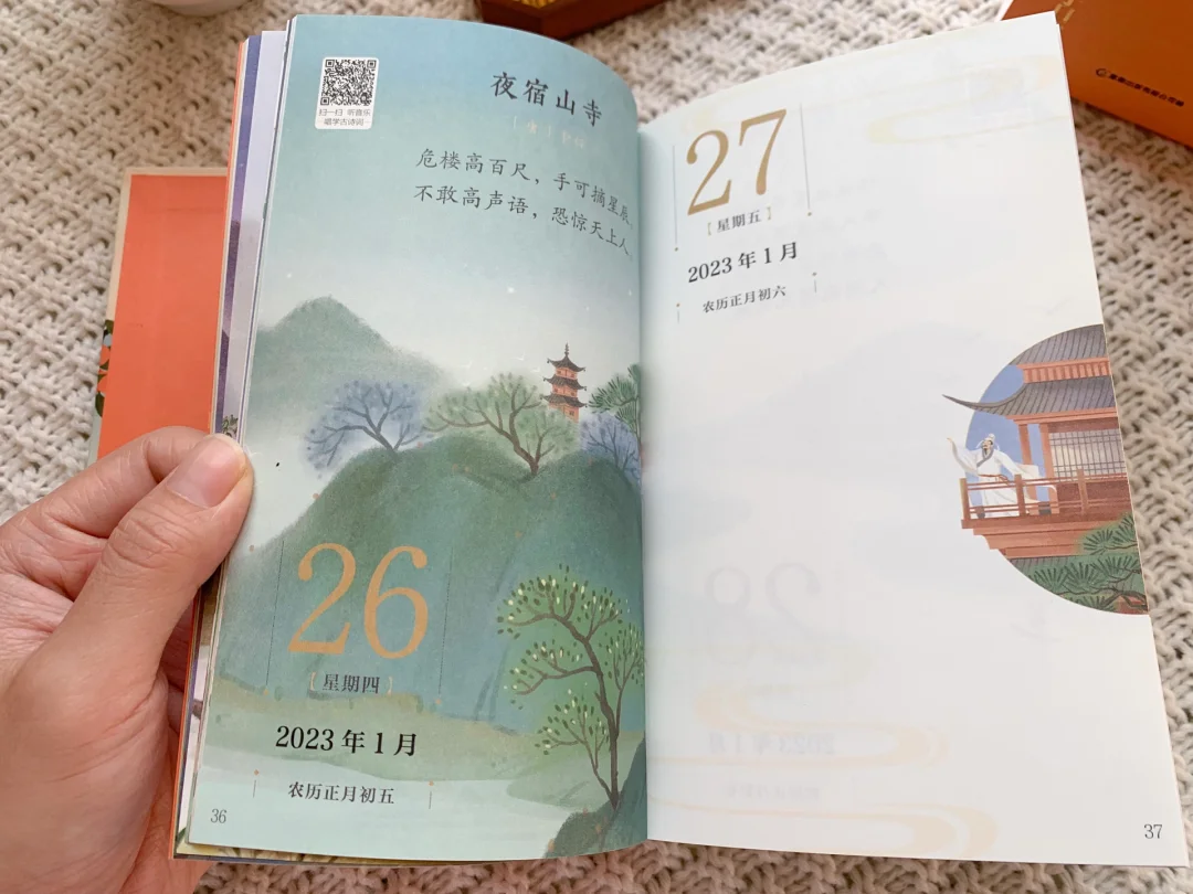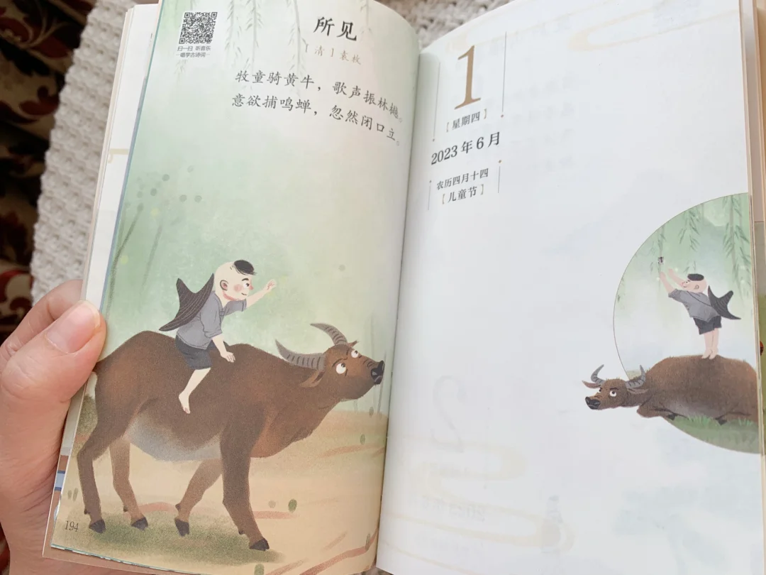 🎊这本日历来的太及时了,对于家长们来说,恨不得让孩子三岁识千字,五岁背唐诗,当然这只是美好的愿望,总之希望孩子从小对中国传统诗词耳濡目染,可往往受制于环境而实践不了。 🌈然而这本《唱学古诗词日历》却让这一切变成现实。不仅可以让孩子从小懂得珍惜时间,还可以让孩子每天阅读对应的古诗词,甚至还能通过听音乐的方式唱学古诗词。 💡除了内容丰富以外,这本日历装帧精美,画质清晰,纸张质感好,令人赏心悦目。 🎁这本日历送人也非常合适,不仅寓意好,同时也十分美观,送人非常体面。