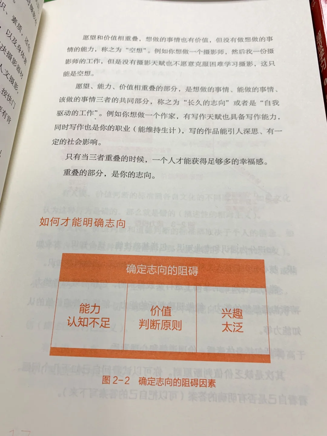 愿望、能力、价值相重叠的部分,是想做的事情、能做的事情、该做的事情三者的共同部分,称之为“长久的志向”或者是“自我驱动的工作”。只有当三者重叠的时候,一个人才能获得足够多的幸福感。