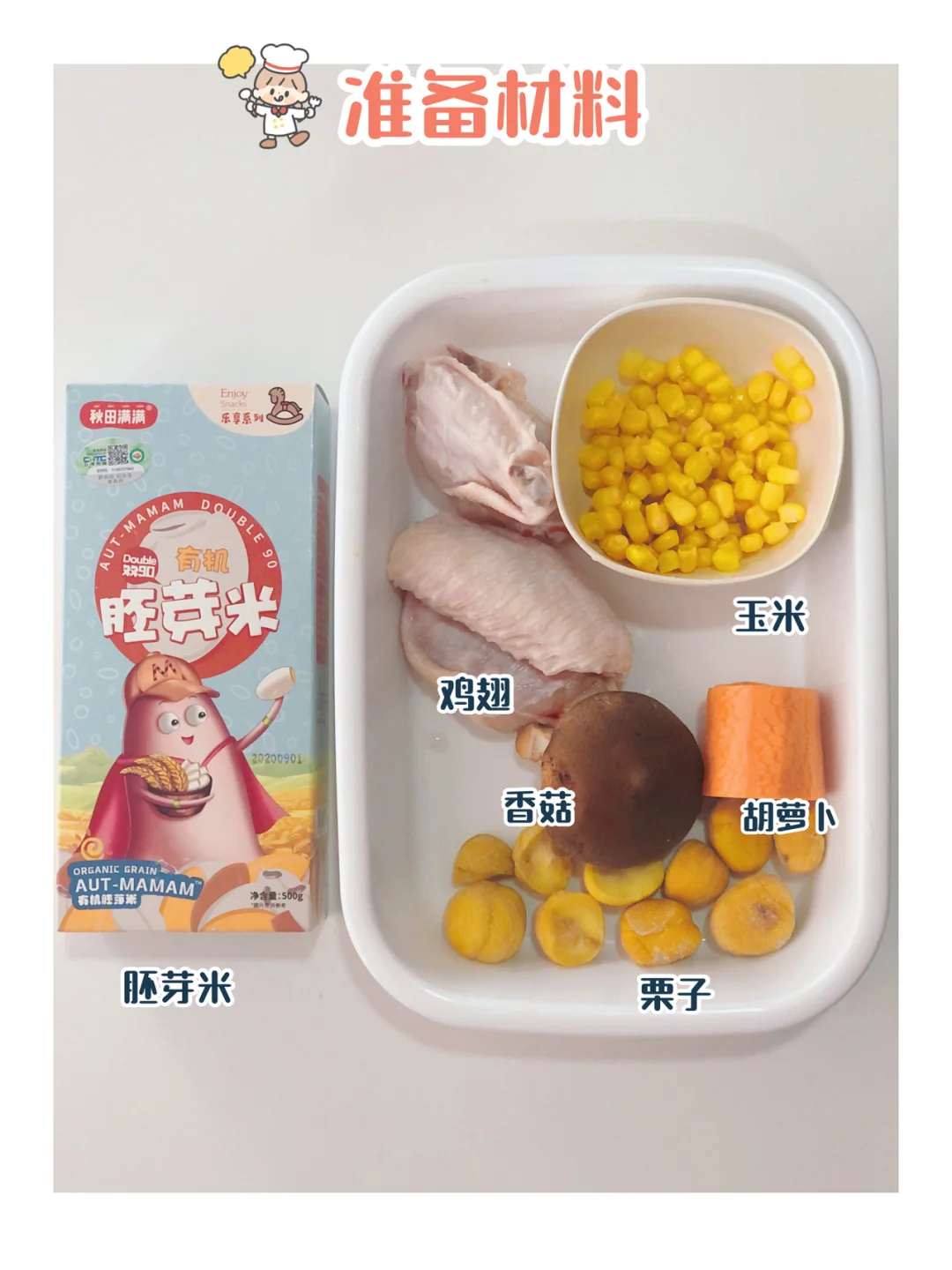 ✅准备食材:鸡翅、胡萝卜、香菇、板栗、玉米、胚芽米.