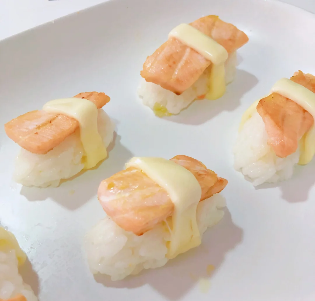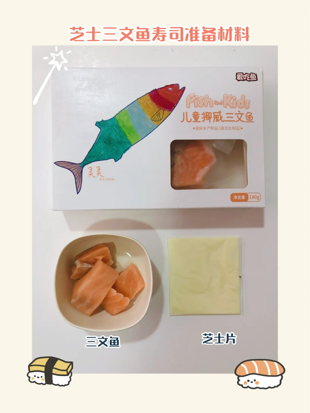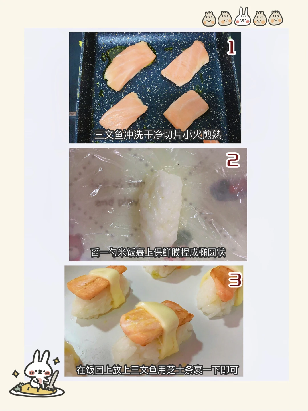 🎈三文鱼用清水冲洗一下,切成片,锅中刷油,油热后小火两面煎熟,舀一勺米饭用保鲜膜包裹,捏成椭圆形,在饭团上面放上三文鱼片,最后芝士切条,裹在饭团上即可。