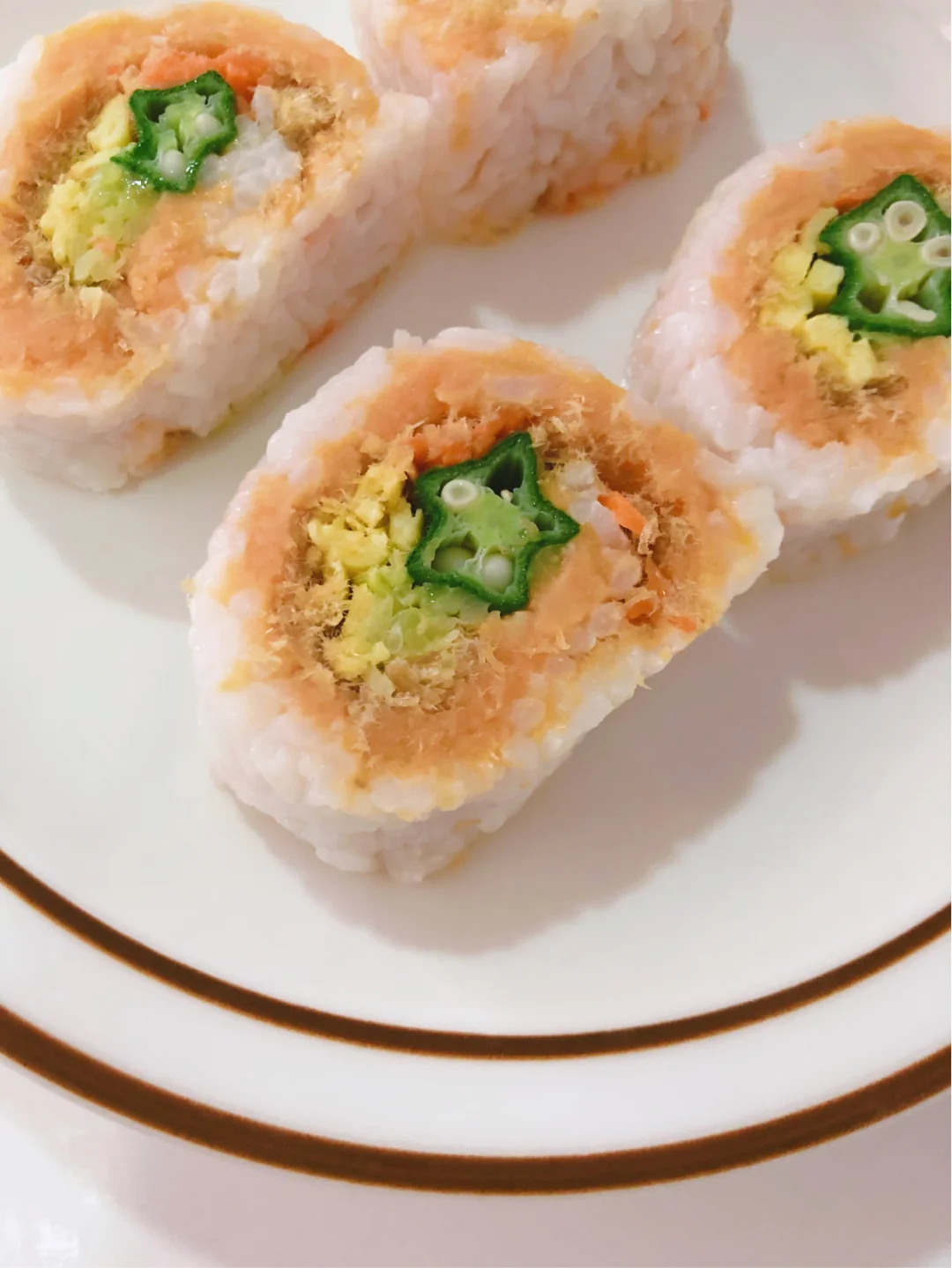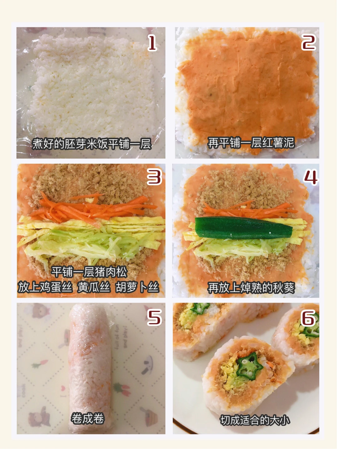🎈取一张保鲜膜,上面先均匀的码上米饭,再铺上一层红薯泥,再均匀的撒上肉松,中间放上鸡蛋丝、黄瓜丝、胡萝卜丝,最后放上秋葵,卷成卷(卷的时候卷紧一些,后面切的时候不容易散),刀上沾点水,会比较好切,切成适合宝宝拿的大小,最后取下保鲜膜就可以啦[斜眼R]