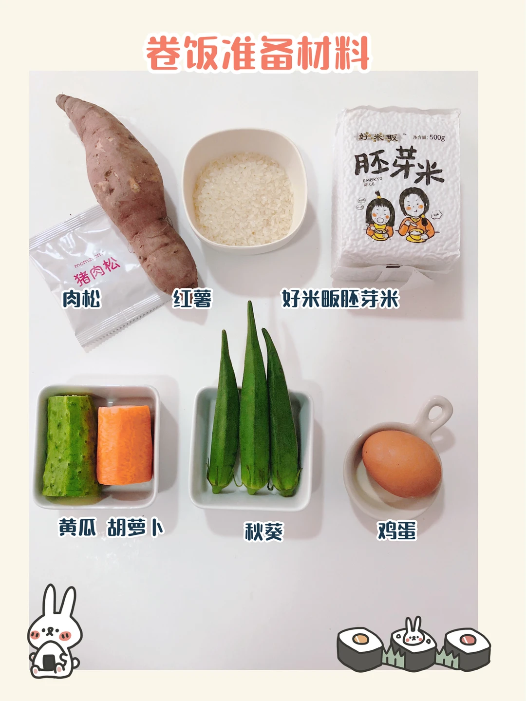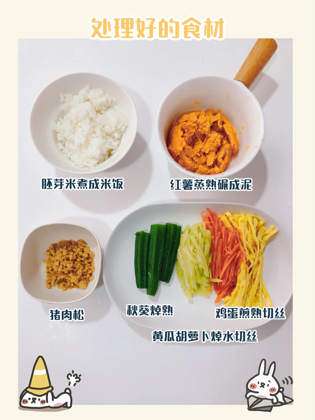 🎈胚芽米提前煮成米饭备用,红薯去皮切块蒸熟碾成泥,鸡蛋摊成鸡蛋饼皮切丝,黄瓜和胡萝卜焯水切丝,秋葵洗净去头去尾焯熟备用(焯水的时候加点盐)