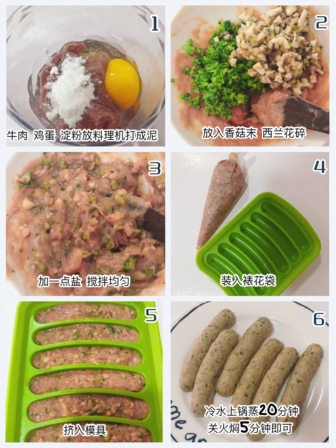 🎈装入裱花袋,挤入香肠模具冷水上锅蒸20分钟,关火焖5分钟脱模即可.
