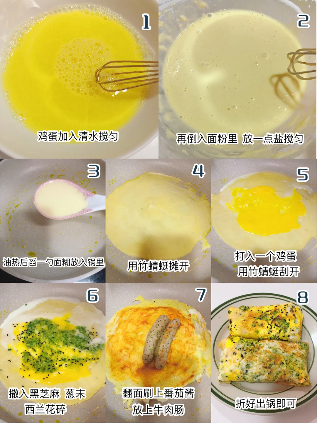 🎈锅中刷油,小火,用勺子舀一勺面糊倒入锅中,用竹蜻蜓转圈快速摊开,打入一个鸡蛋,用竹蜻蜓把鸡蛋刮开,接着撒上葱末和西兰花碎、黑芝麻,待饼边微有卷起,就可以翻面了,翻过来刷上宝宝番茄酱,放上2根做好的牛肉肠,把饼折叠起来,出锅即可[斜眼R]
