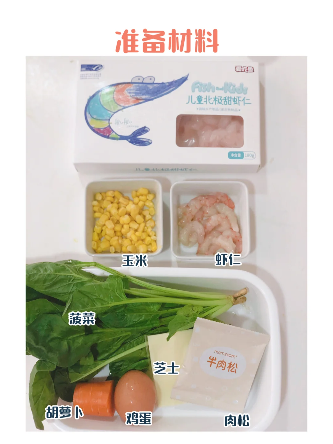 🎀准备材料:虾仁、鸡蛋、菠菜、胡萝卜、肉松,芝士片,米饭是用的黑米、紫米、胚芽米一起煮的(搭配比例:7:2:1)