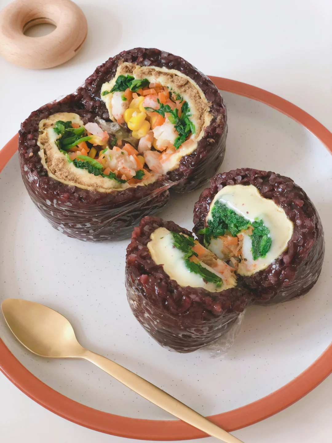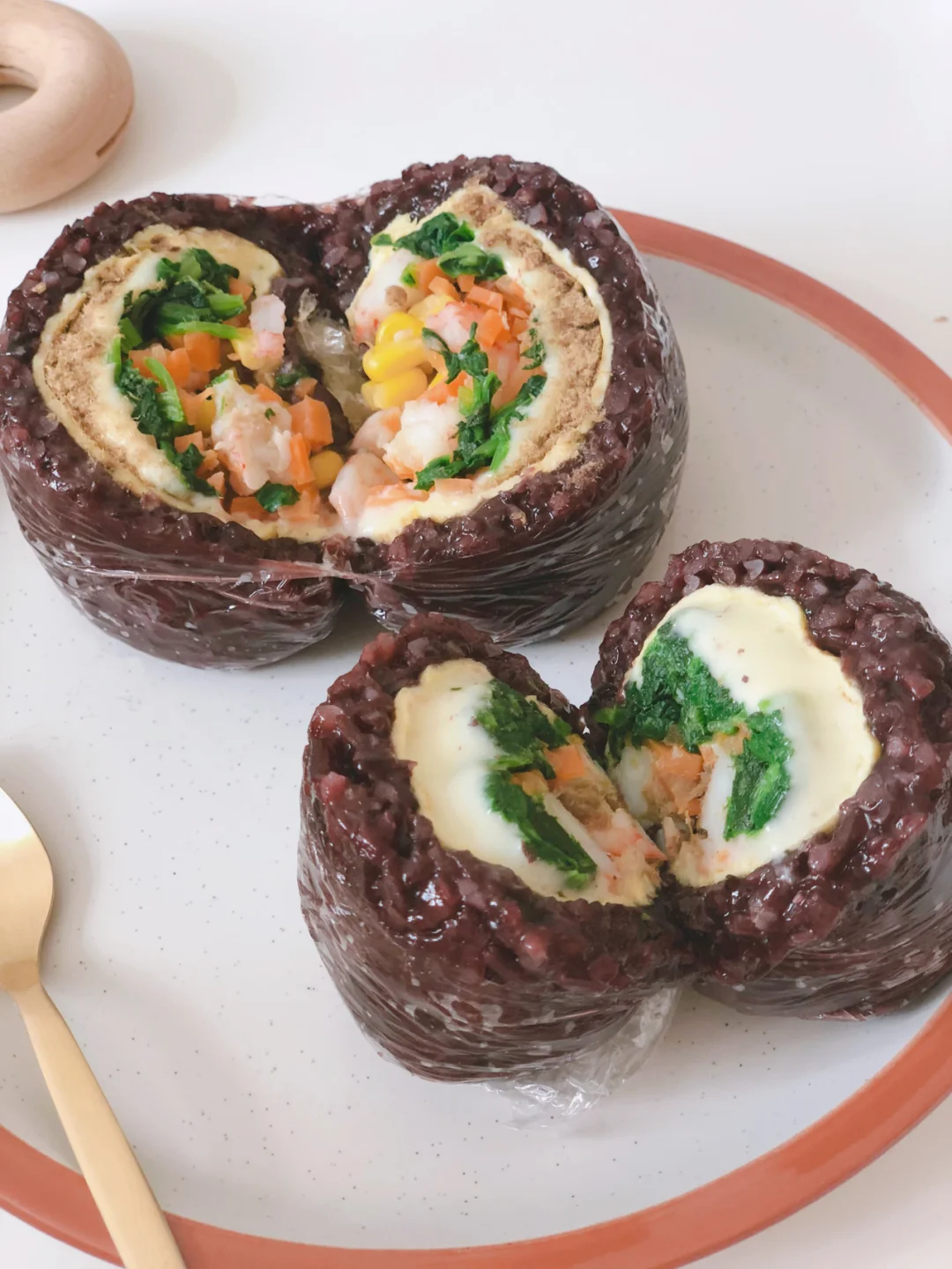 🎈桌面平铺一块保鲜膜,把米饭均匀的码上,再放上鸡蛋皮,菠菜,胡萝卜、芝士片,虾仁、玉米,把保鲜膜的四角揪起,裹成圆形的饭团(尽量裹紧一些,后面切的时候不容易散)最后一切为二即可。