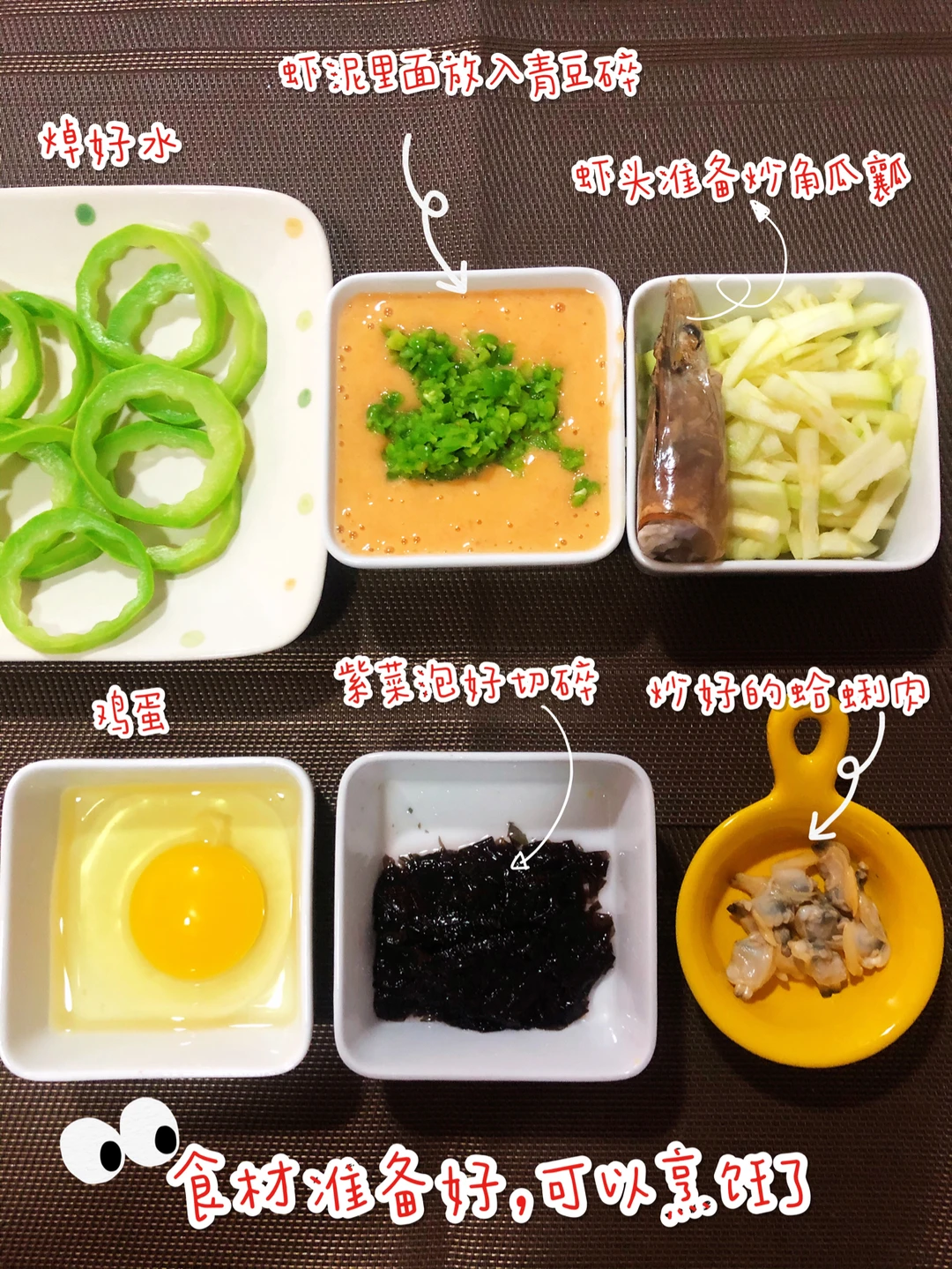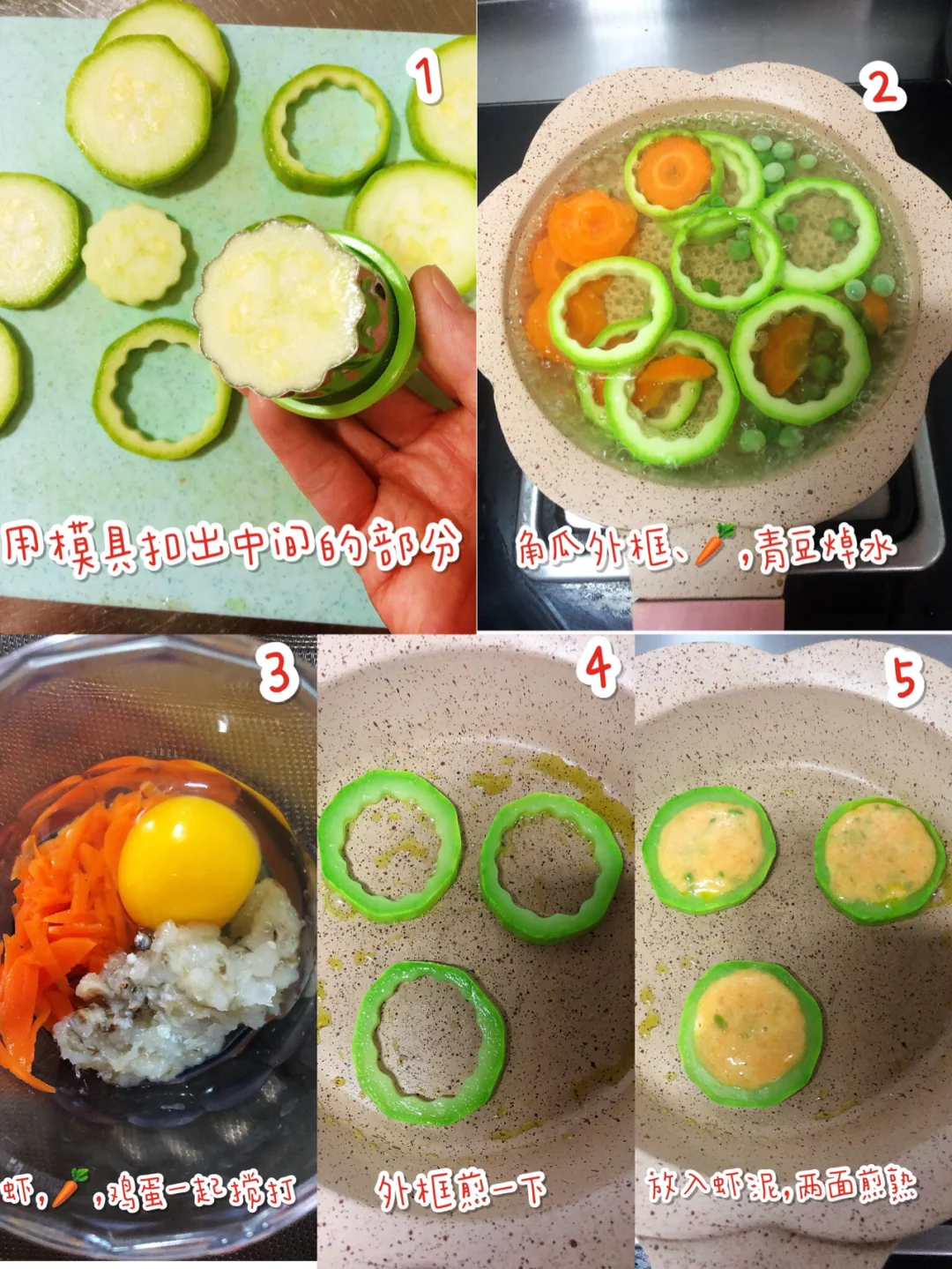 [微笑R]制作方法:🎀1.角瓜虾仁饼:角瓜洗干净,切片,用模具扣出中间的瓤(瓤和虾头下一到菜用),胡萝卜切片和角瓜外框,青豆一起水开煮一下,捞出,青豆去外皮切碎,虾去皮、去虾线,切成块和焯好水的胡萝卜,再加一个鸡蛋一起放料理机打成泥,然后加入青豆碎,加入少许盐,搅拌均匀,锅内倒入宝宝油,油热放入角瓜框煎一会,再用勺子舀入虾泥填满中间部分,两面煎至金黄就可以啦.