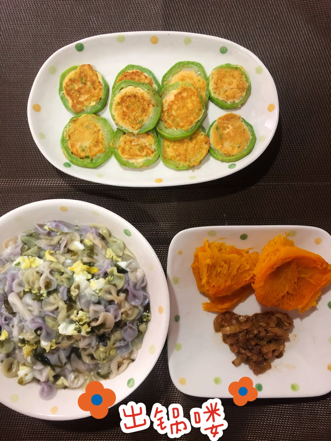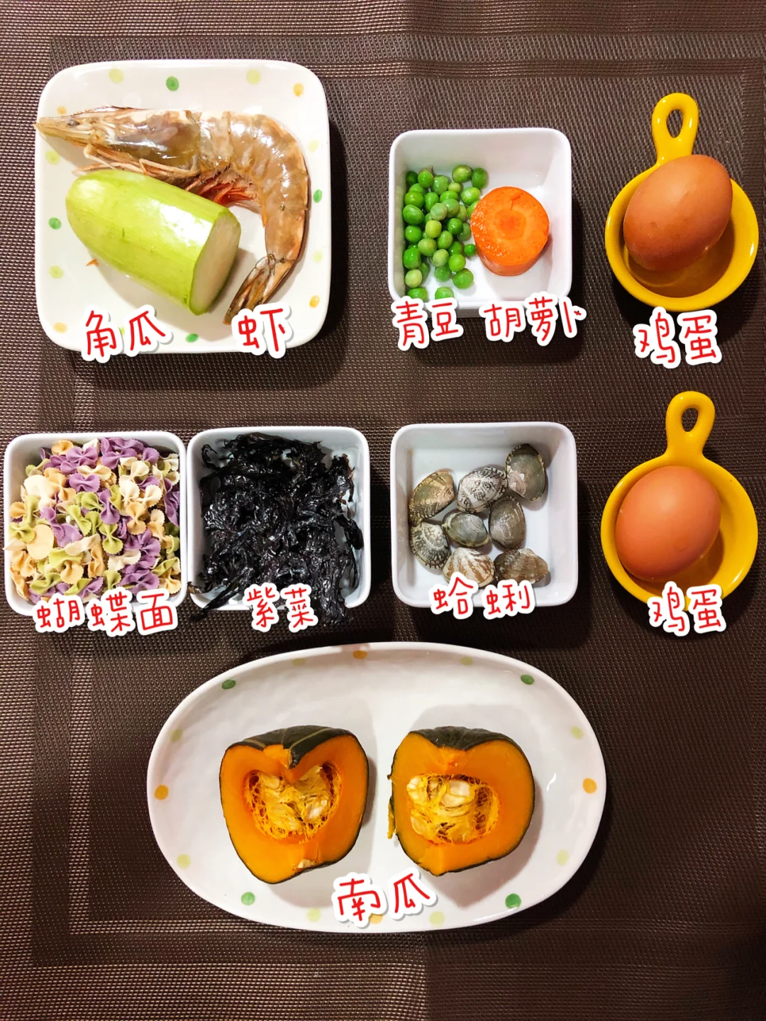 [微笑R]今天给宝宝做了:🌟角瓜虾仁饼 & 🌟虾头炒角瓜丝 & 🌟蒸南瓜 &🌟蛤蜊肉紫菜蝴蝶面
