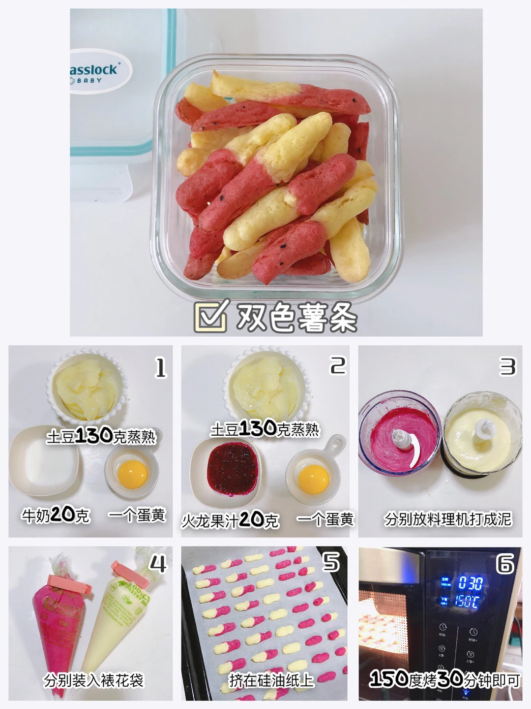 🎈土豆泥+牛奶+蛋黄 / 土豆泥+火龙果汁+蛋黄,分别放料理机打成泥,分别装入裱花袋