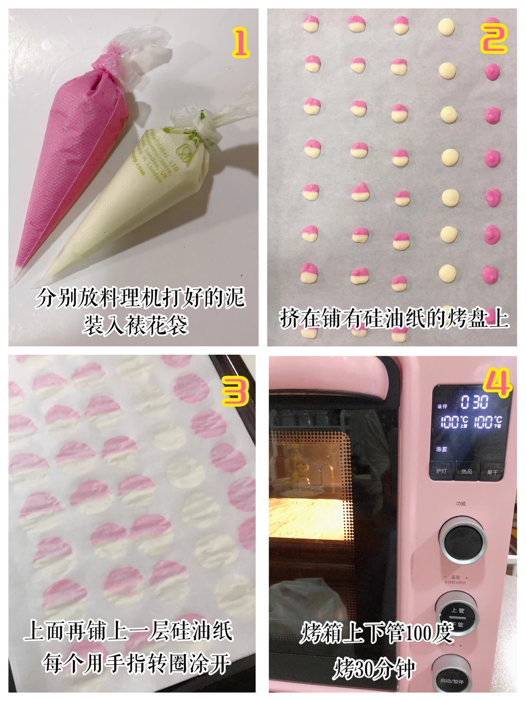 🎈上面两种口味的材料,分别放料理机打成泥,装入裱花袋,烤盘上铺上硅油纸,均匀的挤在烤盘上,间隔距离不要太近,以防后面涂开的时候粘在一起(💡两种口味也可以混在一起挤成双色的哦)表面上再铺上一张硅油纸,用手指转圈涂开尽量薄一些.