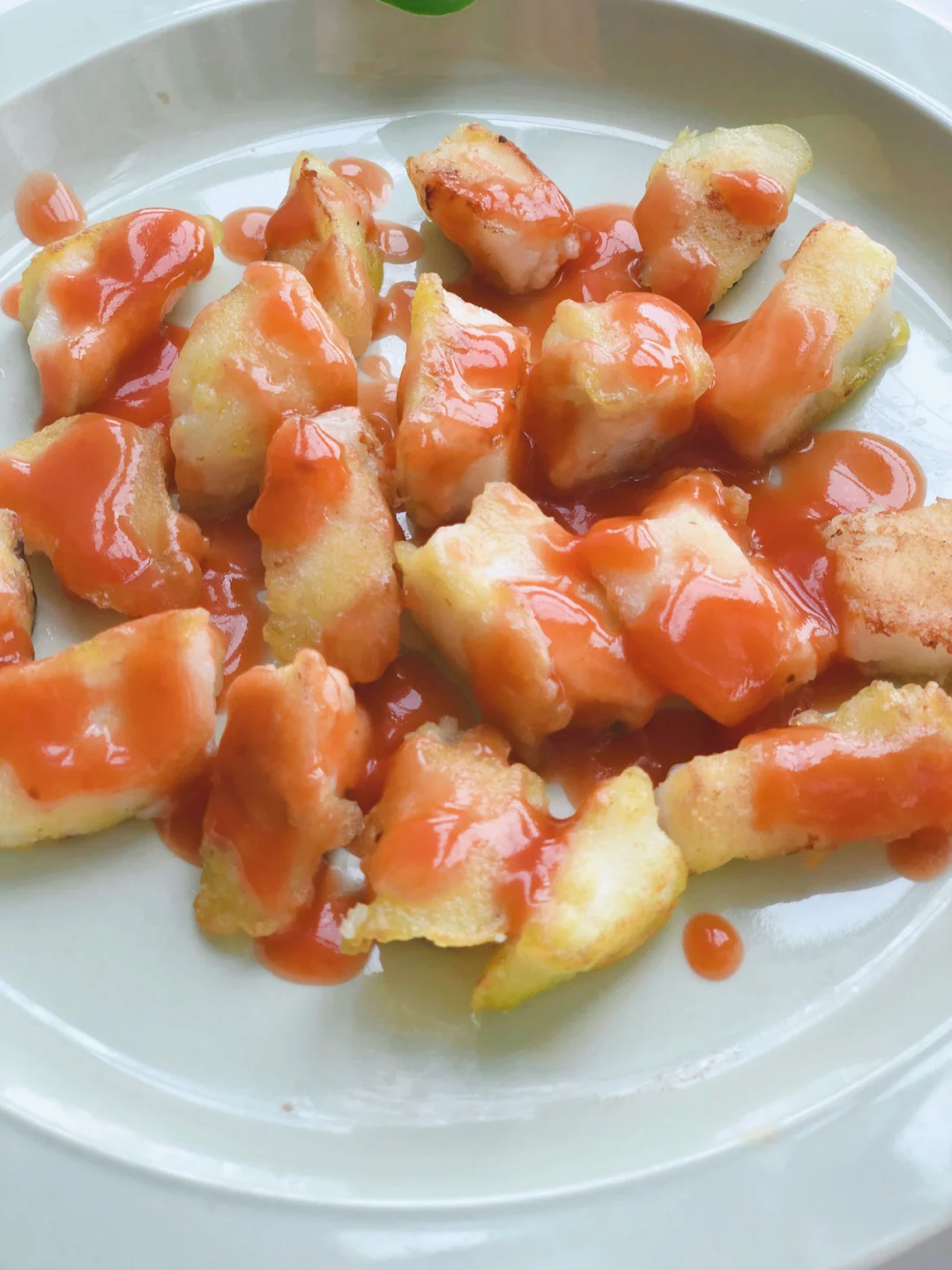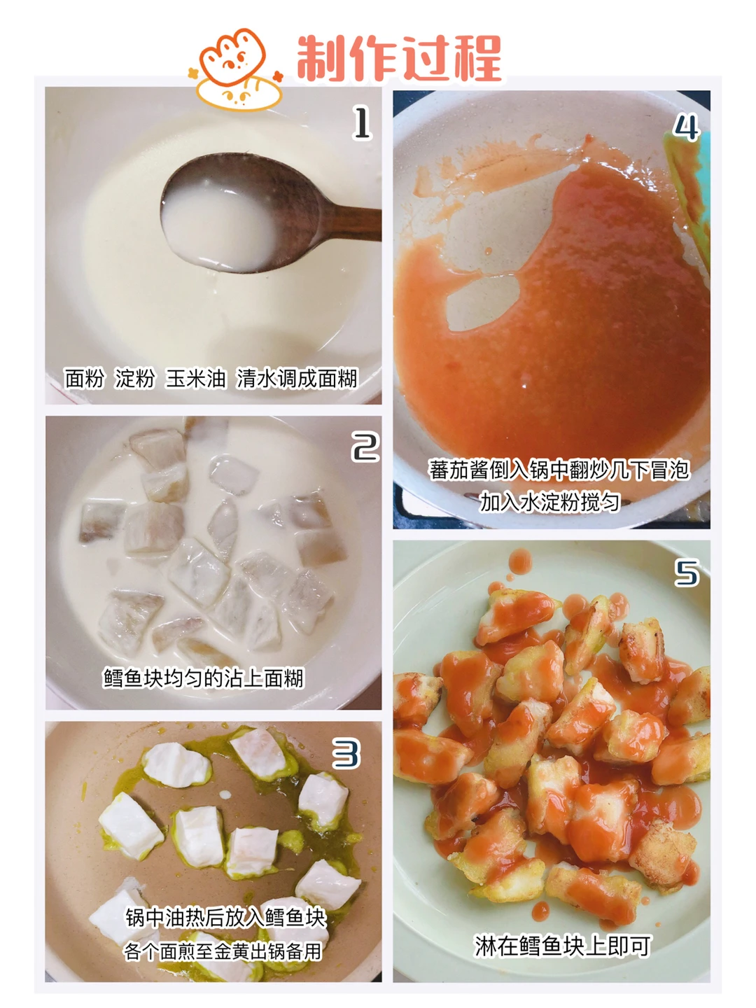 🎈另起一锅,把番茄酱倒入锅中翻炒冒泡,倒入适量的水淀粉搅一下,关火,把番茄芡汁均匀的浇在鳕鱼块上就完成了。(不喜欢番茄口味的,煎完直接吃也非常好吃,外酥里嫩的口感宝宝一定爱吃)