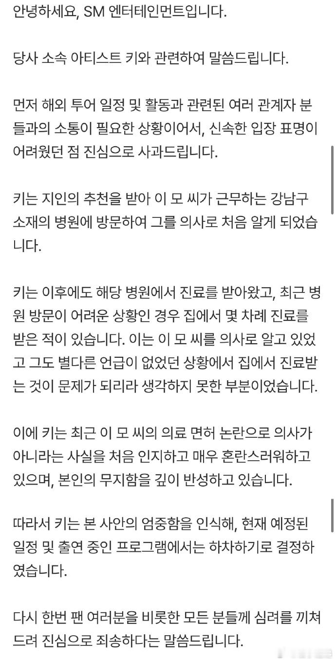 KEY承认非法注射 SHINee成员KEY已就其接受非法注射治疗一事进行说明,并宣布暂停演艺活动。其经纪公司表示,他是通过熟人介绍误信了对方。此事也引发了公众对艺人健康管理及医疗安全的关注。