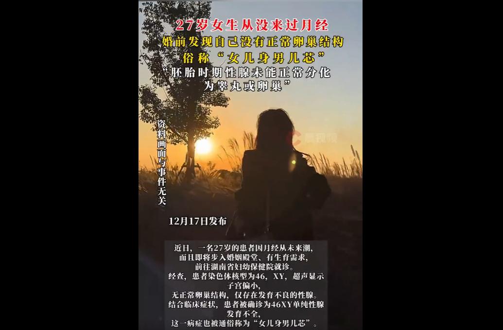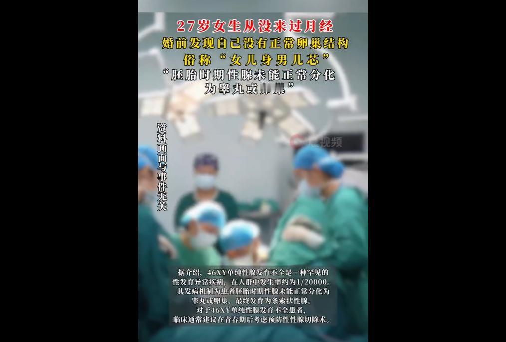 湖南 27 岁小李因从未来例假、有生育需求就医,确诊为 46XY 单纯性腺发育不全(“女儿身男儿芯”),性腺已恶变,术后恢复良好。 该病发病率 1/20000,青春期后恶性风险高,医生呼吁 13-15 岁出现异常需及时就诊。 小李拖到 27 岁才就医,或许并非刻意忽视健康,更多是对生理知识的不了解。 青春期没来例假时,她可能和不少人一样,觉得 “再等等就会来”,这种对身体信号的误判,其实是很常见的认知偏差。 当然,这也反映出我们在生理健康科普上还有提升空间。 家长若能更早和孩子聊聊身体变化,学校若能更细致地开展健康课程,或许小李就能更早意识到 “原发性闭经” 需要重视,不用等到性腺出现问题才就医。 好在手术很成功,小李也迎来了康复。 这件事更像一个温和的提醒:身体的异常信号从不是 “小事”,不管是自己还是家人,多关注、早咨询,就能少些健康遗憾,让身体始终处在更安心的状态里。