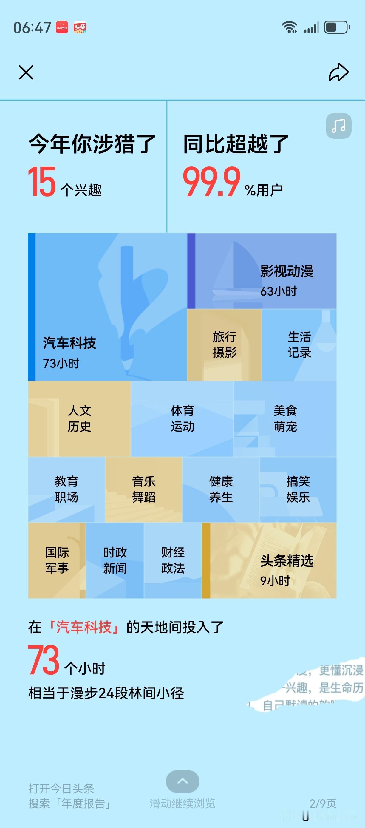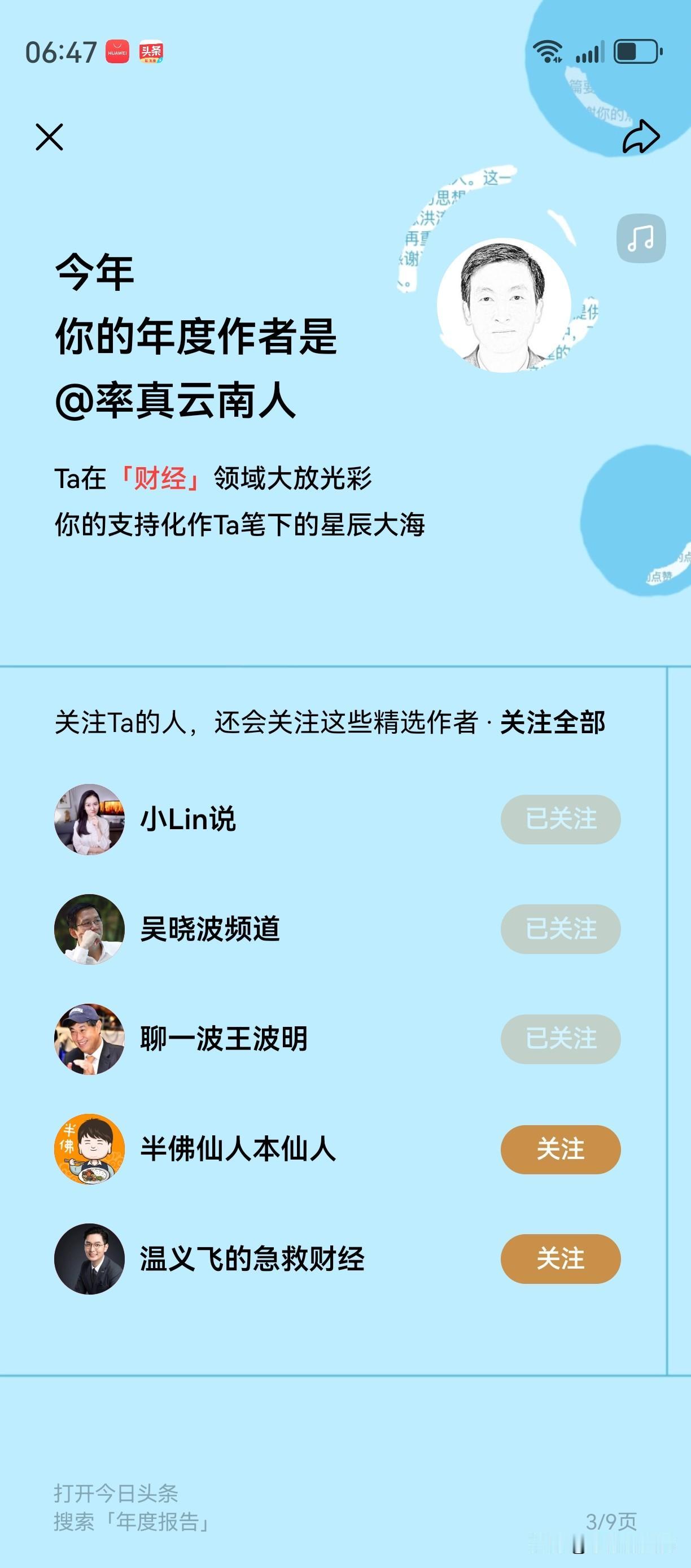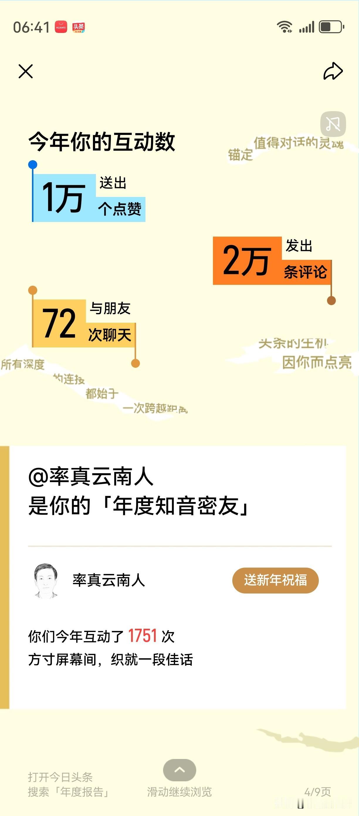 2025年度年度报告已出炉,但奇怪的是一共9页,我翻到第6页就愣是怎么翻也翻不动了。这是什么鬼? 偶真是勤奋的头条人呐!从元旦至今,我已发表了2409篇作品,赢得1902的倾心关注,共收获215万次阅读。 互动也达到了惊人的数目,送出1万点赞,2万评论,率真云南人是我年度密友! 我想他之所以成为我的密友,是因为不管是他来评论还是我去评论,都是认真读内容,用心发评论吧。 每一份热爱,都有荣光记录。涉猎了15个领域,包括汽车科技、体育、教育、健康等方面,同比超越了99.99%的用户呢! 展望2026,新的一年新的气象,就继续加油咯,友友,我们一起努力吧!