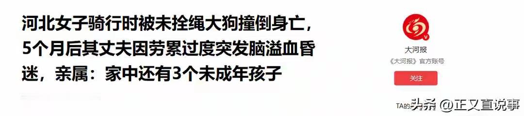 河北邯郸一绳未牵毁两命!37岁妈妈上班路上被大狗撞死,5个月后丈夫累倒ICU,三个孩子恐成孤儿,全网泪崩追问:文明养犬的底线在哪里? 清晨六点的邯郸乡村道路,本该是张女士奔向生计的寻常一程。谁曾想,一只未拴绳的大型格力犬如炮弹般冲出,彻底撞碎了一个家庭。37岁的生命,在剧烈的撞击和头部着地后,戛然而止。她身后,是瞬间崩塌的世界。 丈夫冯建升的天,在那一天塌了。这个沉默的农村汉子,甚至来不及在悲痛中沉溺。妻子的后事要办,年迈的父母要安抚,三个未成年的孩子——15岁、13岁、7岁,正用惊恐的眼睛看着他。他成了这个家唯一的支柱,也是追讨公道的唯一战士。 他奔波在派出所、刑警队、检察院之间,只为给亡妻一个交代。案件定性一波三折,从“交通事故”到“过失致人死亡”,每一步都走得沉重。他还得面对冰冷的现实:妻子是临时工,工伤认定与赔偿维权之路,布满荆棘。生活的重担,无声地压弯了他的脊梁。 这个本就不富裕的家,早已负债累累。冯建升白天为案子奔走,夜里为生计发愁。他不敢倒下,也不能倒下。三个孩子的学费、生活费,父母的医药费,像一座座大山。他榨干自己每一分精力,试图撑住这片即将倾覆的屋檐。 灾难却再次露出狰狞面目。在妻子离世五个月后,连续超负荷运转的身心终于发出警报。一句“头晕得厉害”,成为他倒下前最后的言语。脑干出血,位置凶险。他被推进ICU,生死未卜。顶梁柱,也倒了。 病床外,是冯建升年迈的父亲。这位老人颤抖着在求助平台写下绝望:“我恨自己无能为力。”家里没有积蓄,只有外债。务农的微薄收入,连糊口都难。如今,儿子命悬一线,三个孙儿的学习生活顿失依靠。老人整夜无眠,害怕儿子因无钱治疗而逝,更恐惧三个孩子沦为孤儿。 而这一切悲剧的源头——那只肇事的格力犬,据媒体报道,已被狗主人在案件调查期间打死并丢弃。狗主人的责任尚未最终厘清,但一个家庭已然破碎。文明养犬,一句轻飘飘的口号,背后是沉甸甸的生命之重。一条牵引绳,牵住的是宠物的安全,更是对他人生命的敬畏。 我们不禁要问,为何总是最普通的家庭,承受最沉重的打击?麻绳专挑细处断,厄运专找苦命人。张女士的离世是飞来横祸,冯建升的倒下则是长期透支的必然。他们勤恳、坚韧,努力生活,却敌不过一次他人的疏忽和一连串命运的残酷。 此刻,案件仍在审理,公道仍在路上。但三个孩子的明天,两位老人的煎熬,ICU里丈夫的生命,都刻不容缓。这不仅仅是一个家庭的悲剧,更是对社会良知与救助体系的一次叩问。我们期待法律的公正判决,严惩失责者;我们更呼唤社会的温暖援手,托住这个风雨飘摇的家。 悲剧已然发生,无法挽回。但它必须成为一记响亮的警钟,敲给每一个养犬人,也敲给整个社会。对他人的生命安全负责,是最低的道德底线。愿这样的惨剧不再重演,愿文明的绳索,能拴住平安,拴住千家万户的幸福。 (来源:综合大河报、扬子晚报、大象新闻、中原网、抖音@浪涨新闻等相关报道) 河北身边事