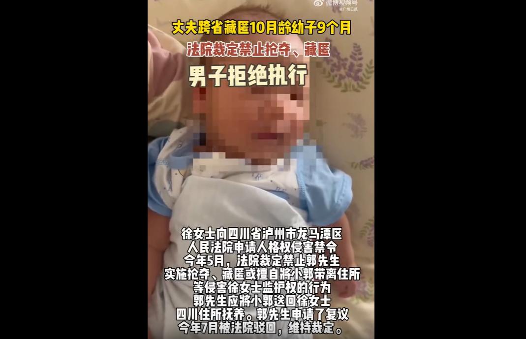 四川徐女士 10 月龄儿子被丈夫郭先生藏至山东 200 余天,郭先生此前两次抢藏孩子,此次更失联拒见。 泸州法院裁定其侵害监护权,要求 7 日内送回,复议被驳仍拒不执行。 徐女士提离婚一审未判离,求助警方、妇联均无果,因郭先生隐匿行踪、执法协作不足,裁定至今未落实。 10 月大的孩子不会说话,却成了最无辜的 “博弈筹码”! 郭先生把孩子藏起来时,根本没考虑过:婴儿对母亲的依恋是生理本能,200 天的分离,可能给孩子留下终身情感创伤 —— 这哪是 “争抚养权”?是打着 “爱” 的幌子摧残孩子! 法院生效裁定未能及时落地,背后反映出四川、山东两地跨区域执法协作中存在的衔接问题 —— 郭先生仅靠更换联系方式、租房就能隐匿行踪,徐女士多方求助却难获孩子线索,这不仅影响了执法效率,也让 “幼儿权益优先” 的原则面临考验。 要改善这一状况,或许可以从建立涉幼案件跨域联动平台入手,推动数据共享以更快锁定当事人行踪,同时明确各部门的响应时限与协作流程。 跨域执法需要更多协同配合,唯有打通壁垒、提升效率,才能更早让孩子回到母亲身边,让 “幼儿权益优先” 真正落到实处。 社会盯着这事,不只是为徐女士抱不平,更是为所有弱势儿童发声:别让 “家庭矛盾” 成为违法的遮羞布! 跨区域执法该打通壁垒,离婚诉讼该更重视幼儿利益,不然今天这孩子被藏,明天还会有更多孩子在 “家” 里失去母爱!