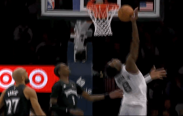比赛的第二节,小贾伦-杰克逊底线运球转身突破,上反篮被篮筐封盖。