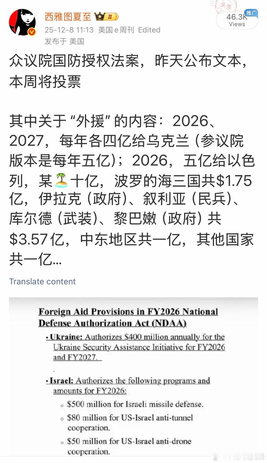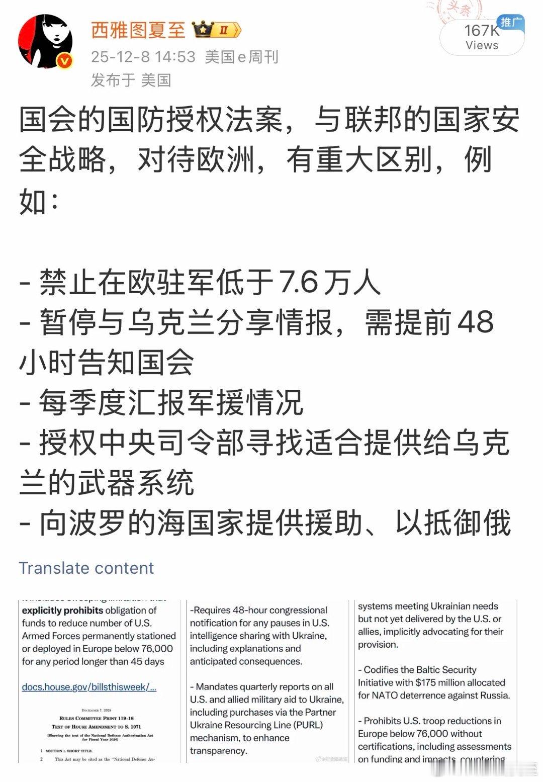 参议院77-20通过2026年$9006亿《国防授权法》众议院上周312-112已经通过,白宫表示“总统会签字”除了军人加薪3.8%、取消对伊拉克战争的授权、限制总统海外行动权、机场加强安保等,“对外”类主要内容包括图二、图三