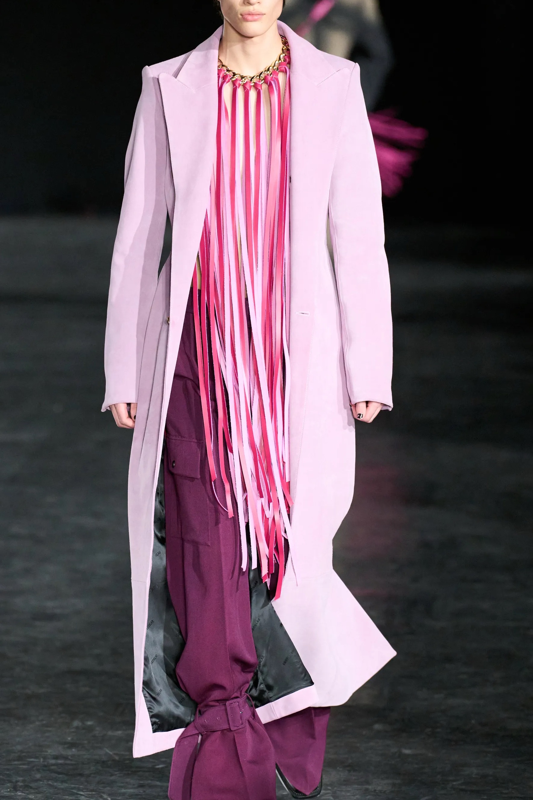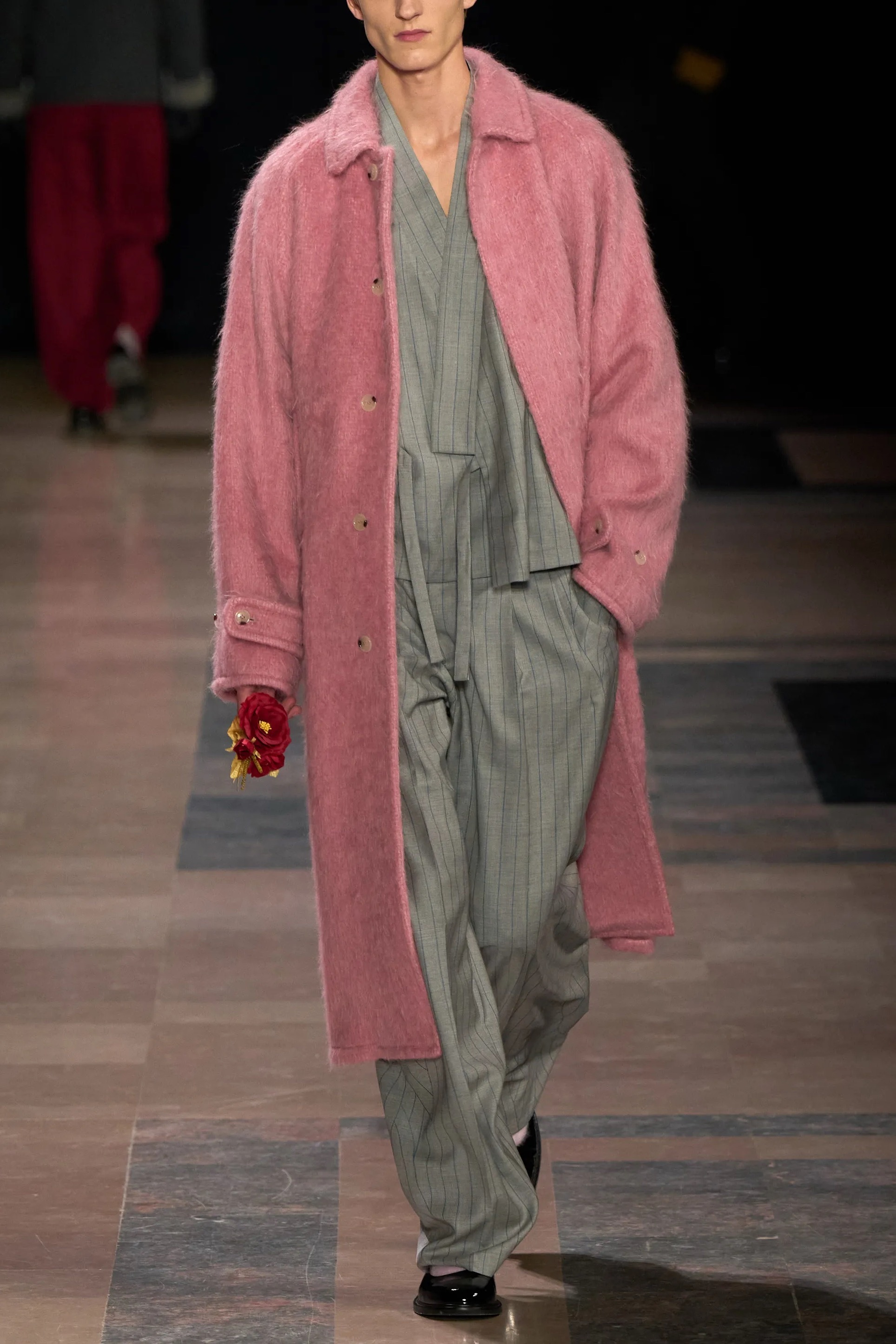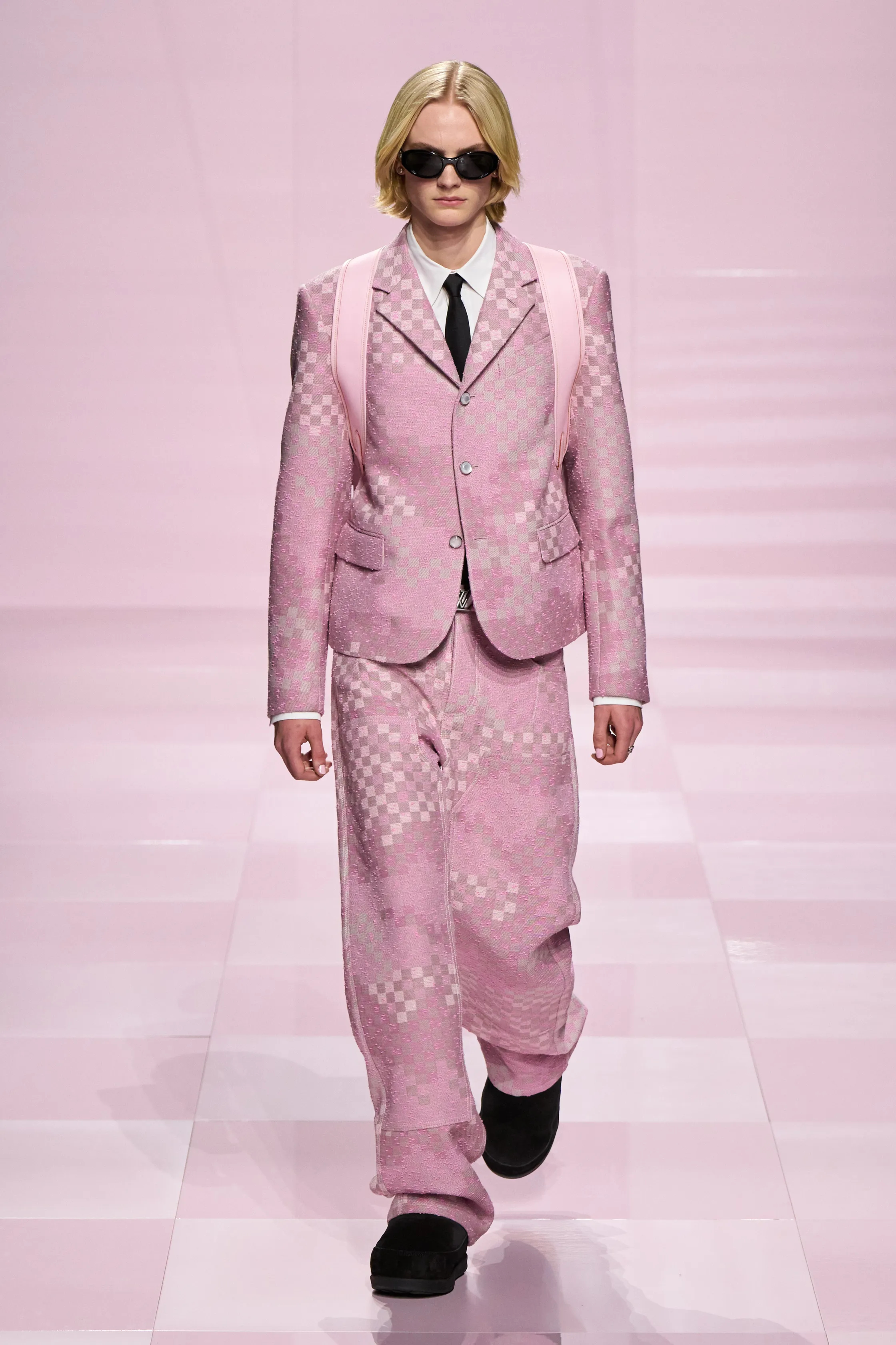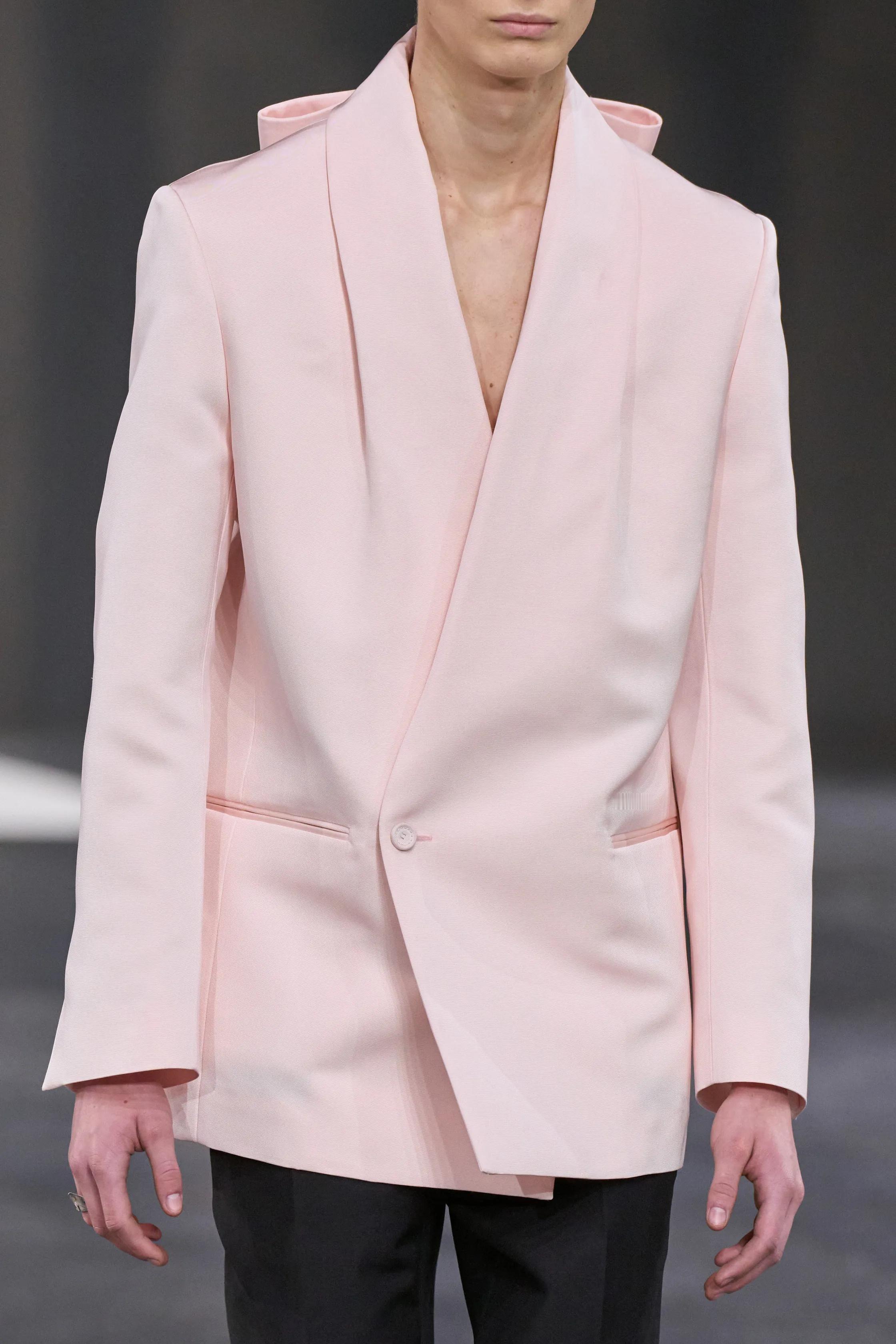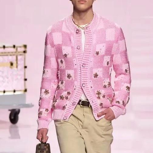 淡雅粉 如果说过去的男装,是在用深色和线条反复强调“力量感”,那 2025 年正在发生的,是一次更安静、也更有深度的转向。作为一个长期观察秀场和日常穿搭的博主,我很明显地感受到:男装里关于色彩的性别界线,正在发生变化,而粉色正站在这场变化的中心。粉色曾经被困在刻板印象里,像是一种需要被解释、甚至被辩护的选择。但现在,它不再需要理由。无论是米兰、巴黎的秀场,还是城市街头,粉红开始频繁出现在男装的核心单品上:西装、大衣、针织衫、工装外套。它不再是装饰性的点缀,而是结构和廓形的一部分。这一点很重要,因为它意味着粉色已经被当作“正常色”来使用。从穿着效果来看,当下流行的淡雅粉并不甜。低饱和、偏灰调的粉色反而让造型更成熟,也更有质感。它削弱了攻击性,却强化了气场。很多男生第一次尝试都会发现,淡雅粉并不会让人显得软弱,反而让整体风格更自信、更松弛。这种松弛感,正是当代男性气质里最稀缺、也最迷人的部分。在我看来,这股趋势背后,其实是社会观念的变化。男性不再需要用单一的审美来证明自己,温柔、细腻、情绪表达,都开始被视为力量的一部分。让男性形象更立体。穿搭上,我一直建议大家把淡雅粉当作基础色来用。搭配西装配白T和牛仔裤,淡雅粉针织衫搭深灰长裤,甚至只是一件淡雅粉外套,都足够成立。重点不是博眼球,而是让它自然地融入日常。风格大赏 时尚灵感解读