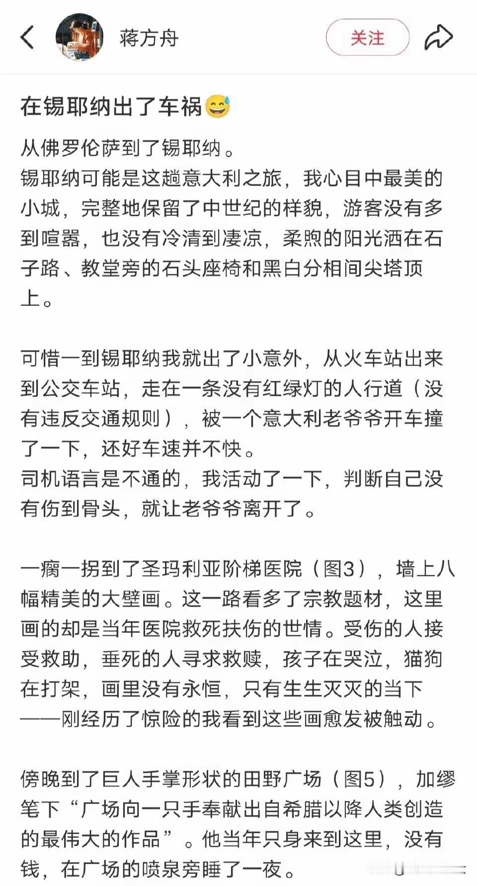 蒋方舟在意大利出了车祸,需要用轮椅代步! 锡耶纳是她心中最美的小城,可惜不应景。 当地人开车毫无素质,横冲直撞,她没有违反交通规则还是被意大利人撞到了。 蒋方舟很大度,没有跟撞到她的人计较放他离开,撞到人的意大利司机也毫无责任心,不管不顾的走了。 小城美但人心不古。 结果是蒋方舟自己一瘸一拐的去医院自费治疗。 在当地的圣玛丽阶级医院,受伤的蒋方舟被医院的壁画触动了! 文化人就是不一样,容易感觉,自适应模式也是常人所不及的。 被车撞了,司机不负责任,自己去看病还能因为壁画产生感触,这种心理活动我完全无法理解。