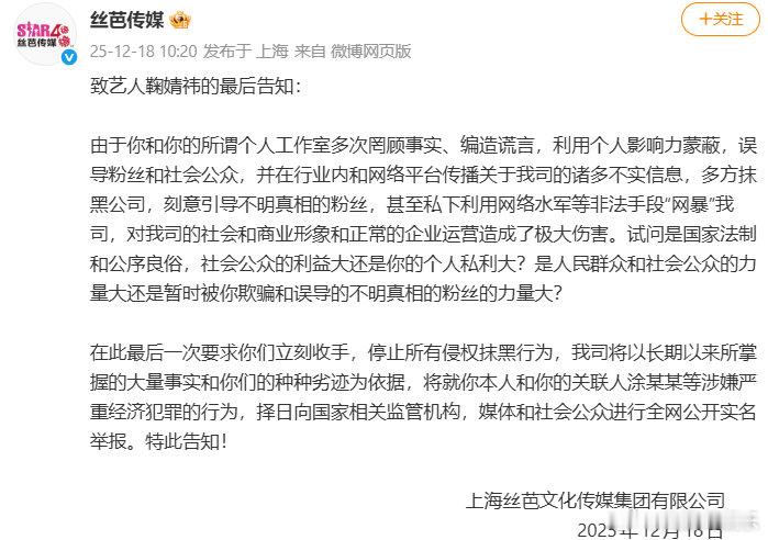鞠婧祎合约纠纷升级丝芭喊话鞠婧祎再不收手将实名举报 近日,丝芭传媒起诉状称鞠婧祎合约至2033年引发热议。12月15日,鞠婧祎方发声明,称与丝芭传媒的经纪合约已于2024年6月终止,指控丝芭传媒伪造艺人签名及授权。12月16日,丝芭称已经委托专业机构就笔记进行鉴定,鞠婧祎应当继续履约。随后,双方就合约以及鞠婧祎待遇收入问题发表多次声明。12月18日,上海丝芭文化传媒集团有限公司在官方微博发布致艺人鞠婧祎的最后告知,告知中称鞠婧祎“涉嫌严重经济犯罪”,择日进行全网公开实名举报。