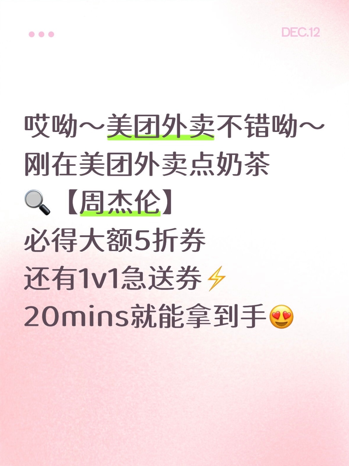 周杰伦报备型艺人实锤了 周董的效率藏在每一次报备里,干饭效率交给美团!12月18号起至1月16号,搜“周杰伦”享顿顿五折,千万张1v1急送券大派送,急送到家超省心~