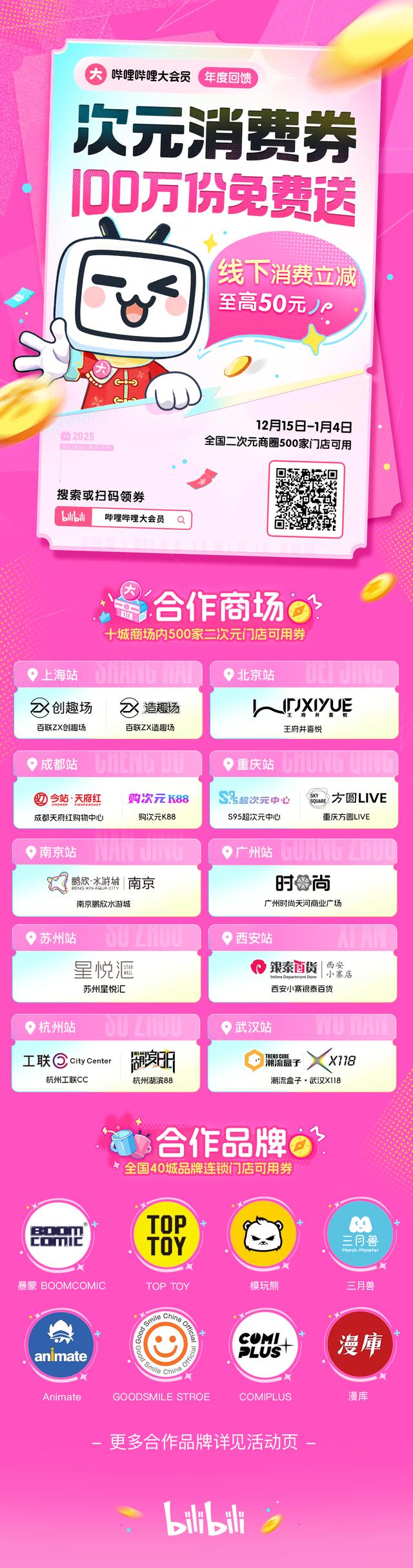 12月15日起,“哔哩哔哩大会员年度回馈”活动重磅来袭,100万份二次元消费券免费发放,邀请你在全国十四个二次元商圈畅享购物乐趣,解锁全新消费体验!