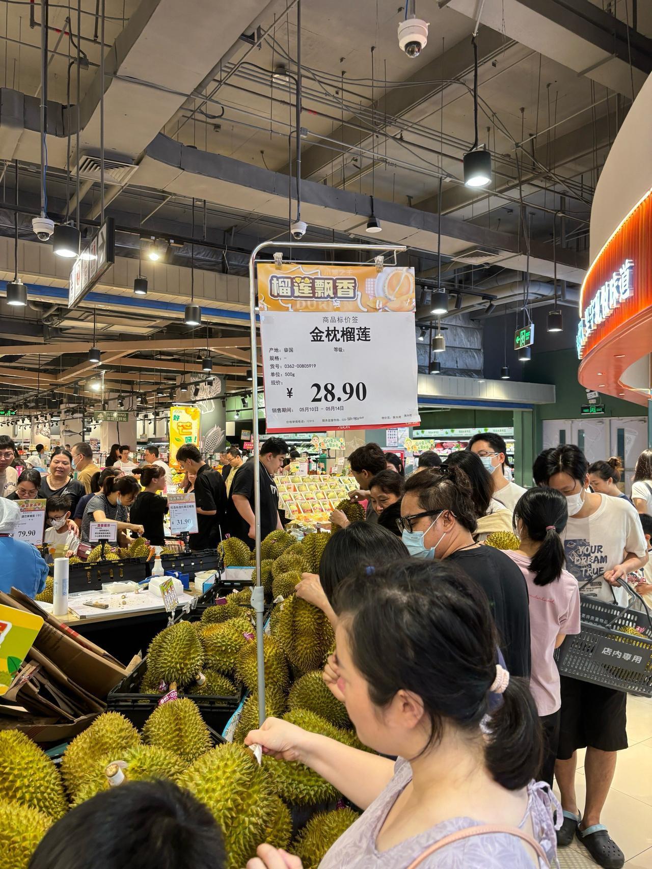 12月18日,海南自贸港封关首日,马来堂哥携首批马来西亚鲜果榴莲快闪海口龙湖天街旺豪超市,现场顾客排起长队购买。有网友称,“现场排了好几百人长队,跟春运火车站一样热闹”。海南自贸区封关 你会去海口购买低价猫山王榴莲吗 海南