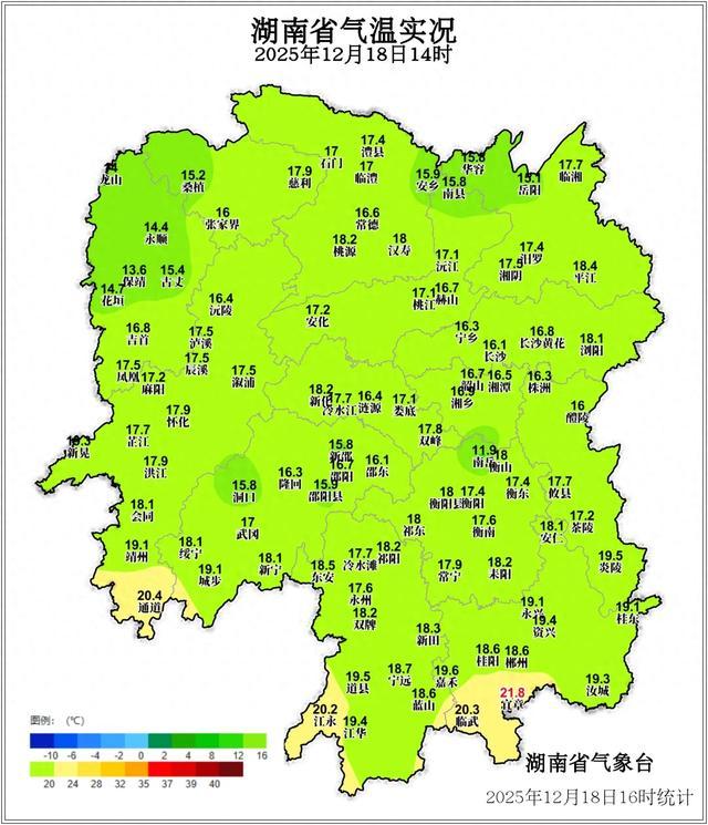 12月18日14时湖南省气温实况图
