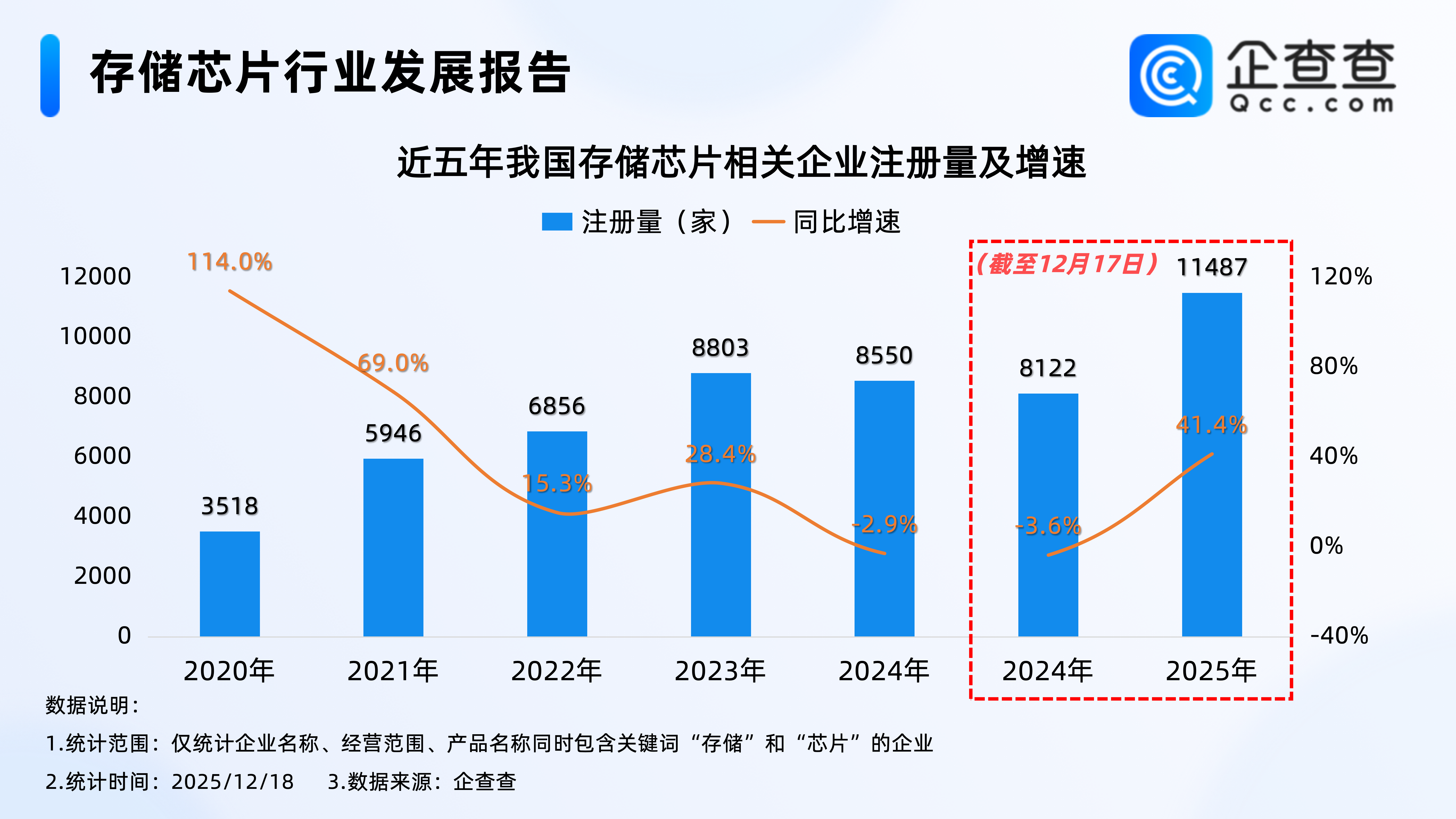 企查查数据显示,2020年以来,我国存储芯片相关企业基本逐年增加,2023年我国累计注册8803家存储芯片相关企业,成为近五年注册量最高的一年,截至12月17日,2025年我国已注册1.15万家存储芯片相关企业,已超2023年全年,相比2024年同期增加41.4%。