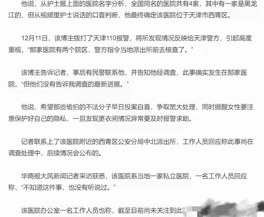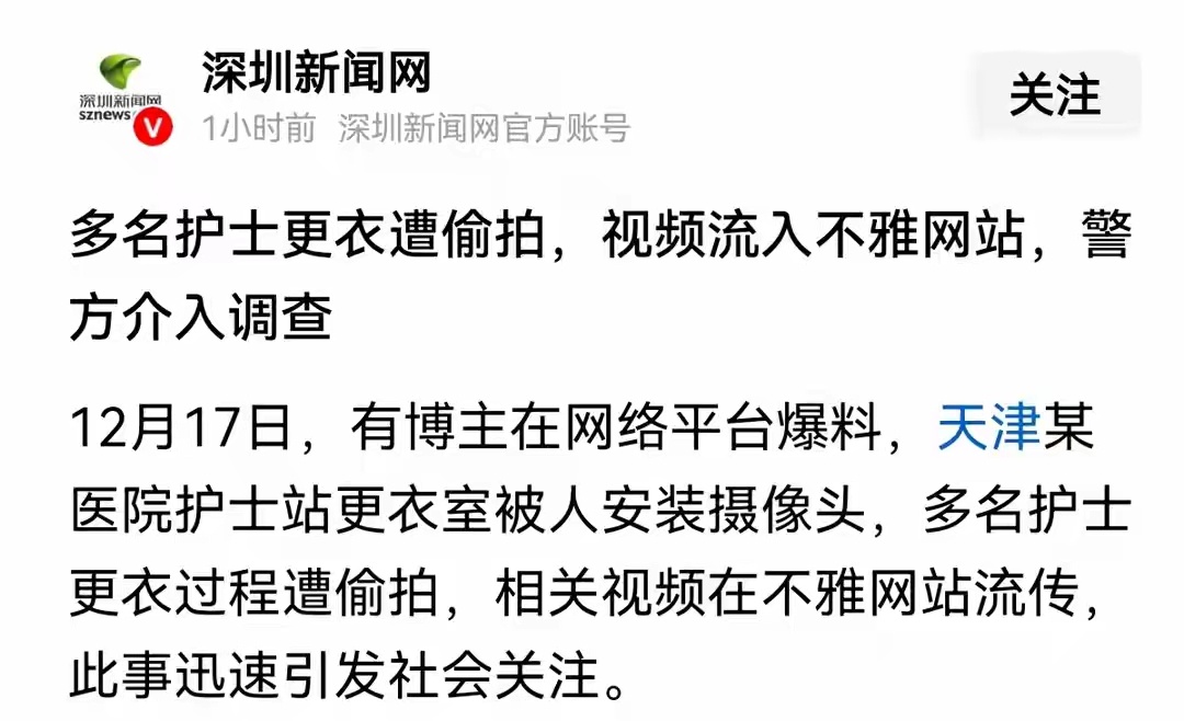 护士在医院更衣室换衣的私密画面,被人装摄像头偷拍还剪了30分钟视频发不雅网站,而涉事医院居然第一时间说“不知情”?这管理漏洞也太大了吧。有网友爆料,网上一个偷拍网站,传出了医院值班室护士换衣服的视频,这位网友就根据医院上的医院名称查找,根据视频中护士说话口音,确定这家医院是天津的。这位网友向当地警方报警,最后该网友接到警方回访电话,确认了偷拍就是发生在这家医院,后续还在进一步调查。目前还不知道是医院内部人员还是院外人员放的。更衣室这种私密区域,摄像头能悄无声息装在桌上不被发现?有些人就喜欢看医生护士视频的癖好,偷拍者投其所好形成一条偷拍产业链,从安装设备到剪辑传播,全程把别人的隐私当赚钱工具,完全没把法律和他人尊严当回事。之前澳洲还出过医生偷拍460名同事5年的事,可见这种恶行根本不是个例。医院护士更衣室偷拍这次不光要抓安装的人,网站传播链也得一查到底。