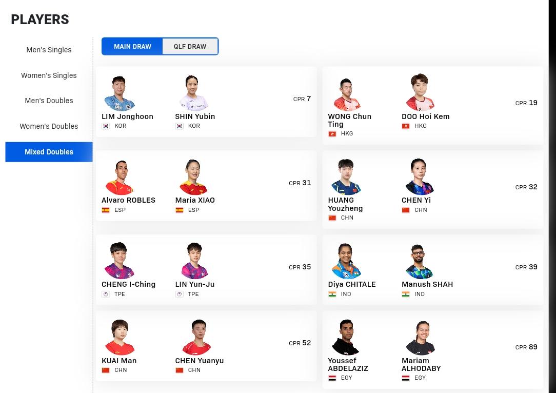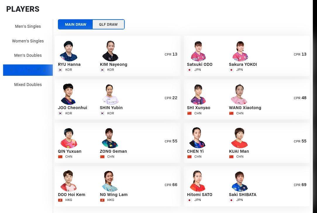 WTT球星挑战赛多哈站双打初始参赛名单公布。 国乒男双三对,女双三对,混双两队。 男双梁靖崑/林诗栋、黄友政/温瑞博、徐瑛彬/陈俊菘。 女双石洵瑶/王晓彤、覃予萱/纵歌曼、陈熠/蒯曼。 混双黄友政/陈熠、陈垣宇/蒯曼 。 外协参赛的实力也不错。 林钟勋/安宰贤,黄镇廷/陈颢桦领衔男双。 柳汉娜/金娜英、大藤沙月/横井咲樱领衔女双。 林钟勋/申裕斌、黄镇廷/杜凯琹领衔混双。