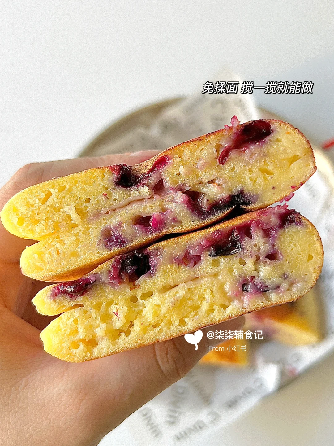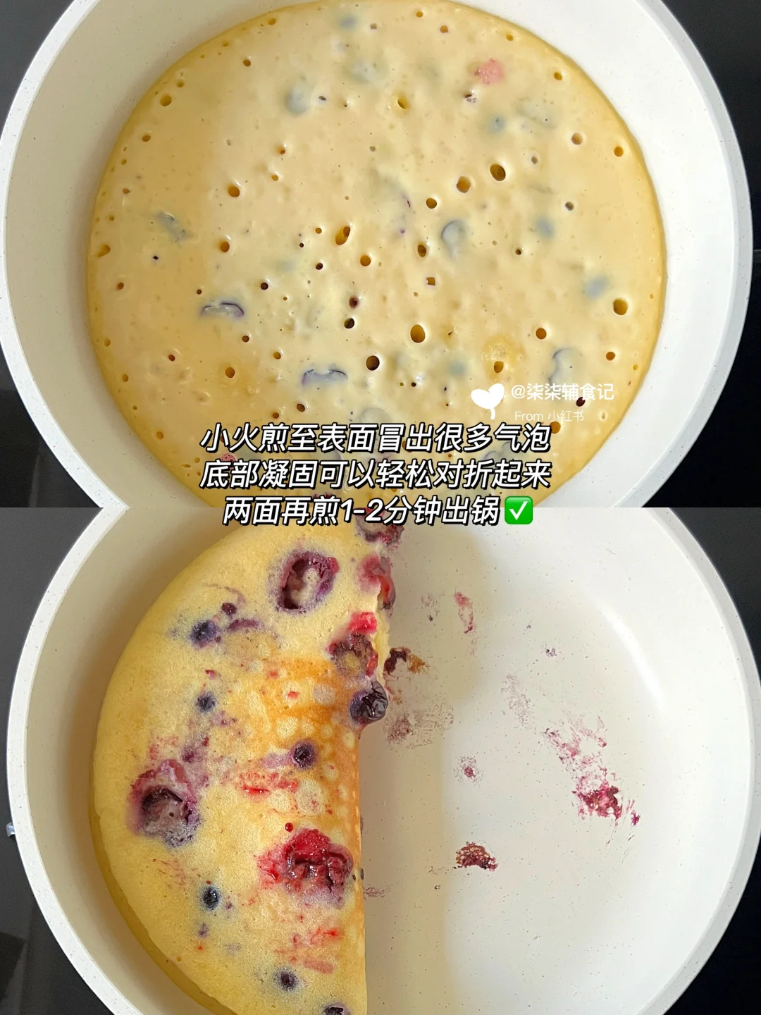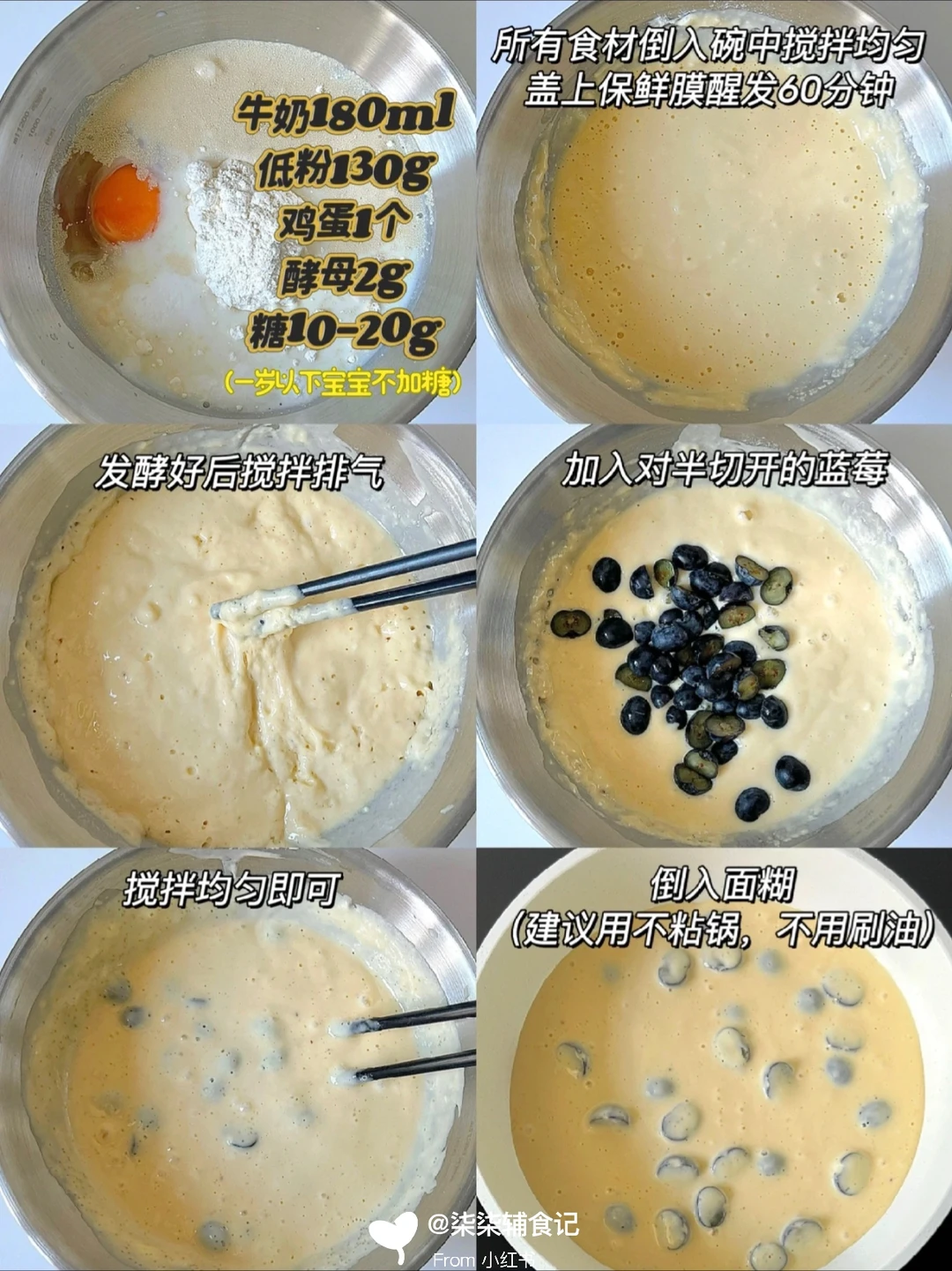 都快去做这个蓝莓厚松饼 搅一搅就能成功,有手就行 真的巨巨巨好吃😋大宝宝可以加点糖更好吃哦[哇R][哇R][哇R] 🛒食材准备: - 牛奶180ml - 低筋面粉130g - 酵母2g - 鸡蛋1个 - 蓝莓适量 🧑🍳制作过程看上图👆 🌟小贴士Tips: 🔺这个配方可以做2张饼哦 🔺一岁以内不添加任何调味品