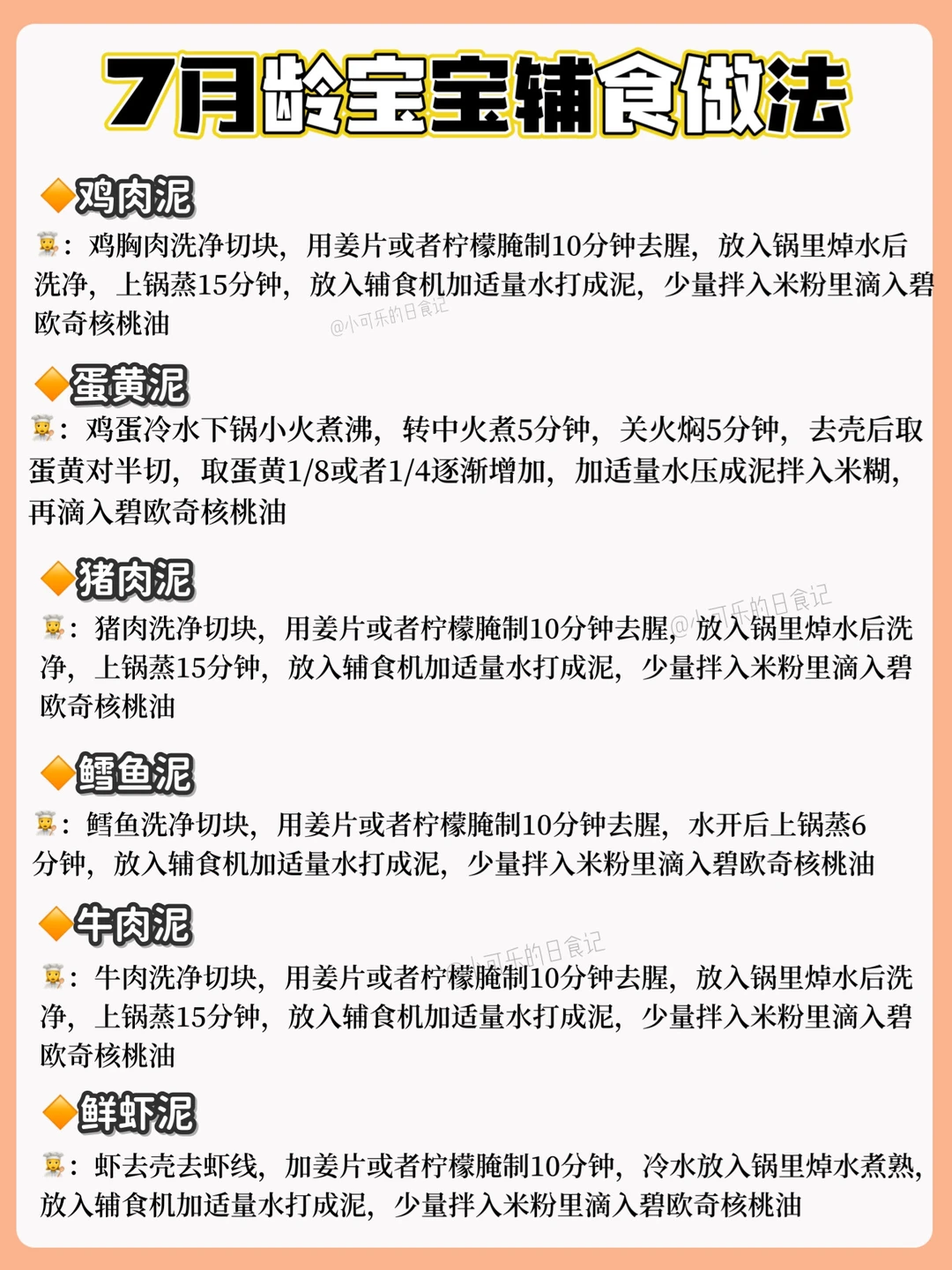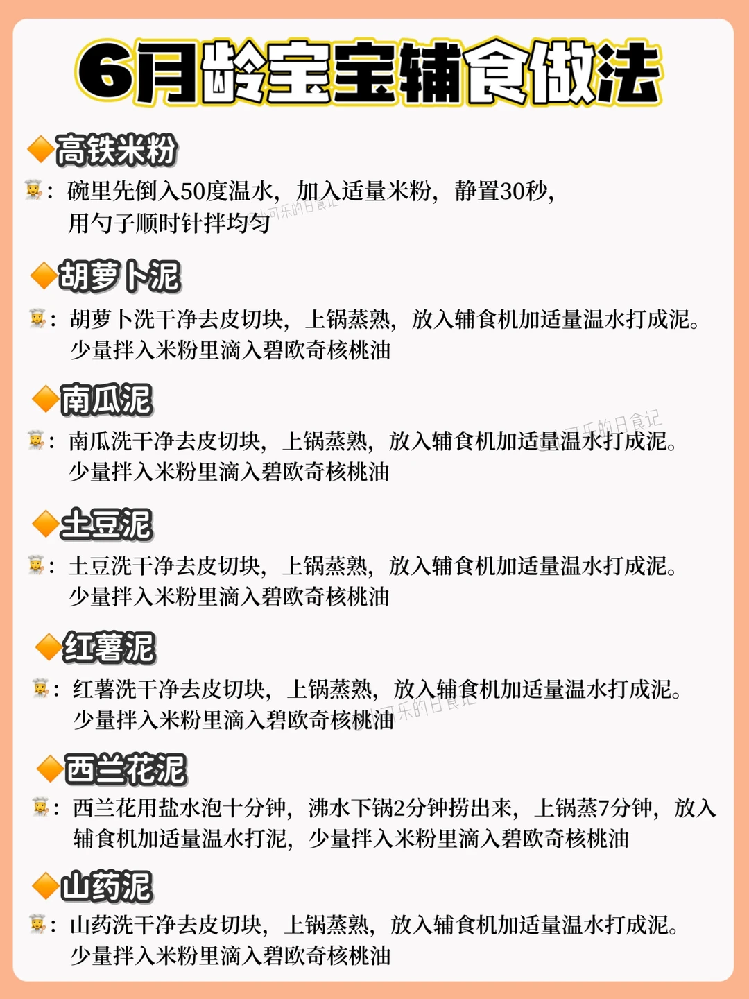 🔸每添加一种食材3天排敏期,如辅食泥第一天1-2勺,第2天2-3勺逐渐增加拌入米粉里滴入核桃油搅拌食用,水果泥可在午觉后单独吃