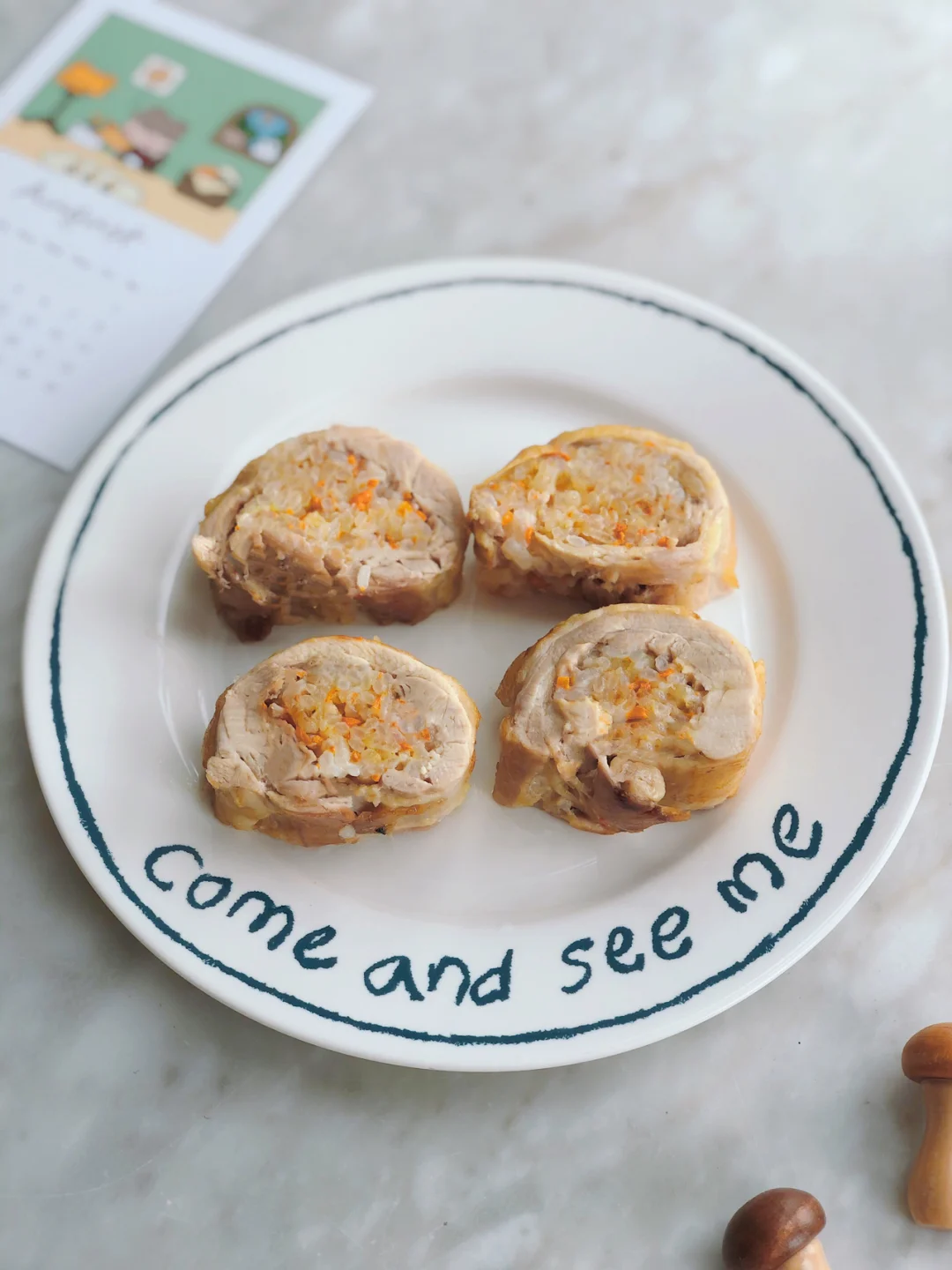 🎈腌制好的鸡腿中间码上米饭,卷成卷,用锡纸包裹住两头拧紧成糖果状,冷水上锅蒸20分钟,取出